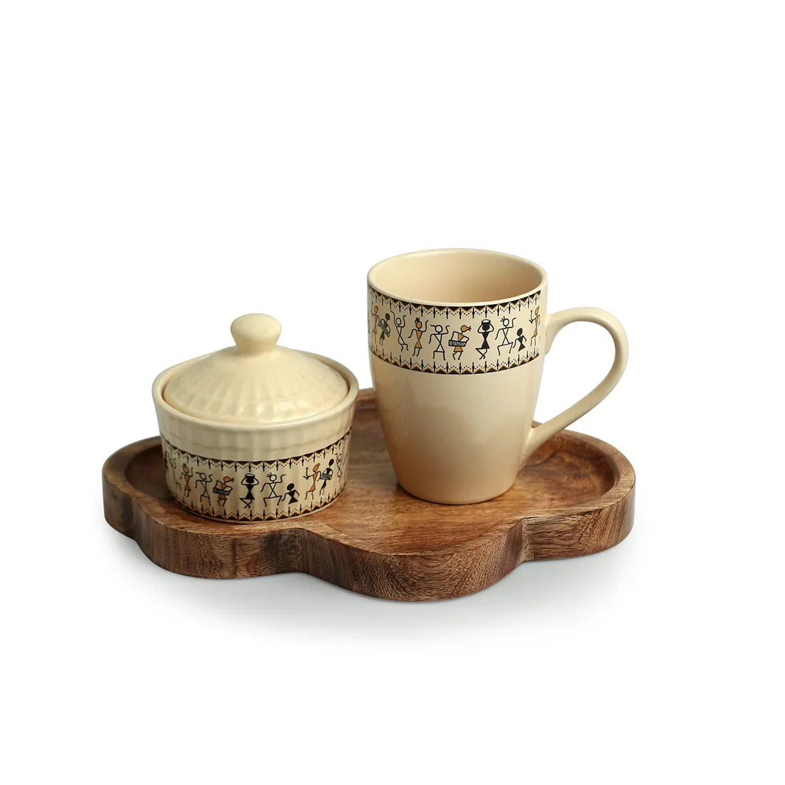 - Depicts beautiful handcrafted coffee mug & nut bowl with 'warli motif' decals placed in an abstract wooden tray.