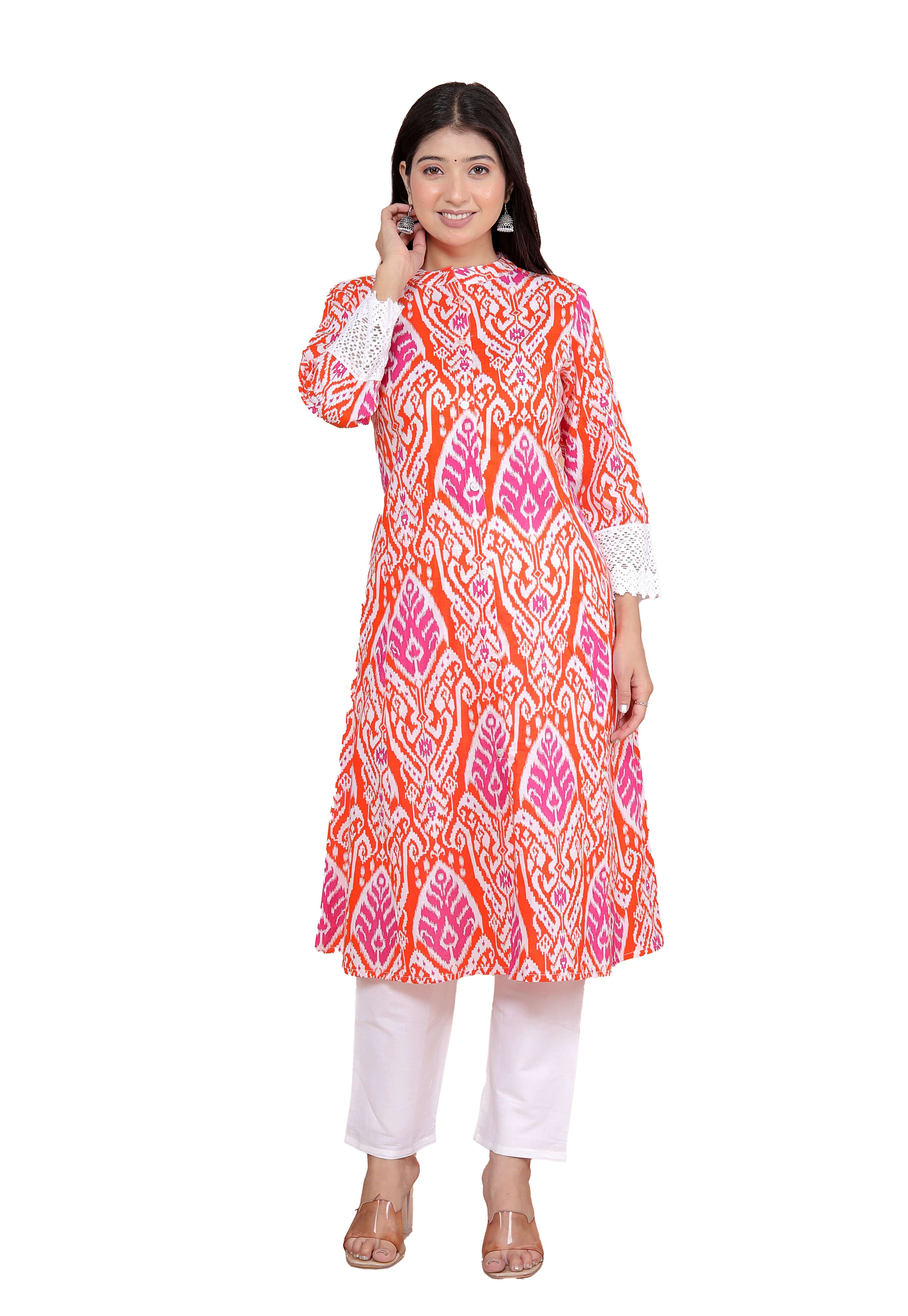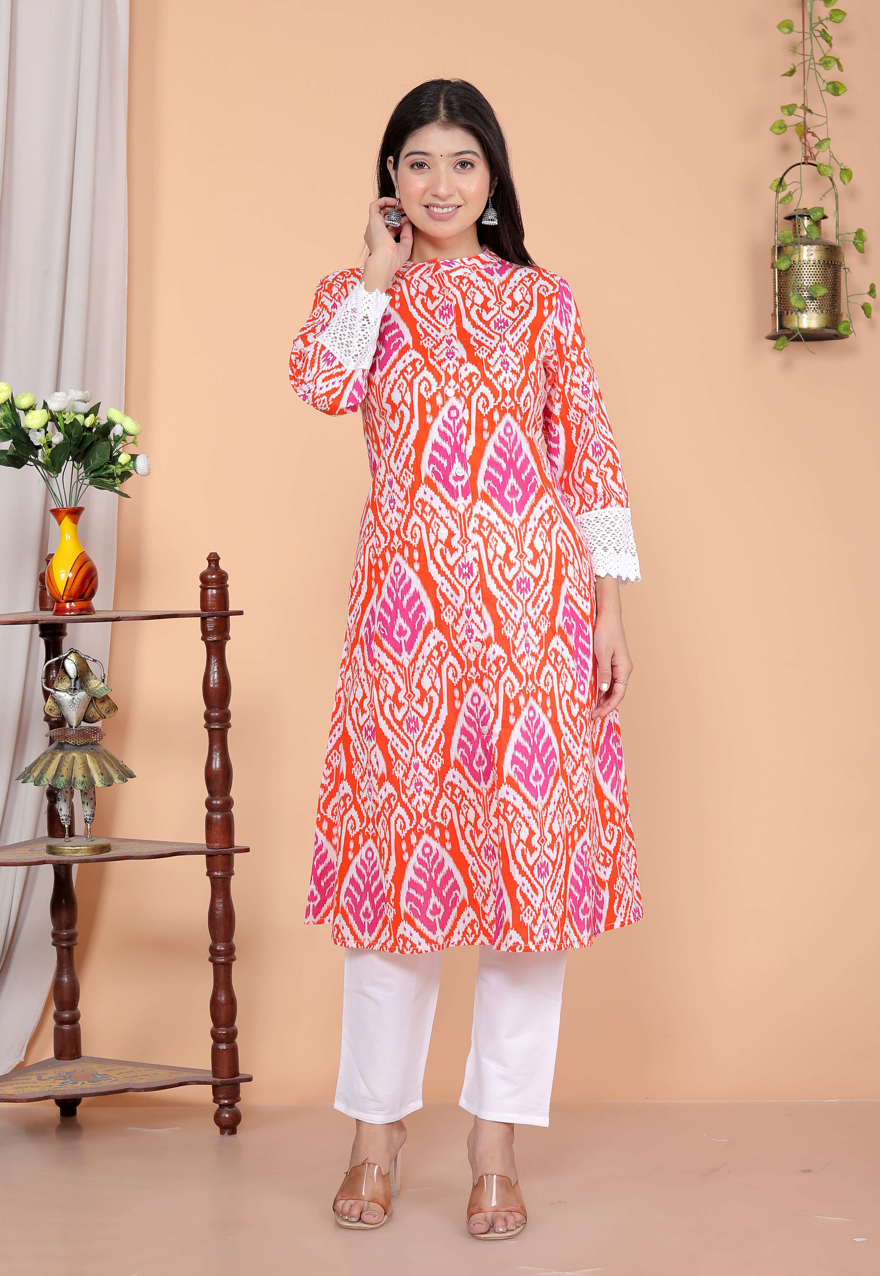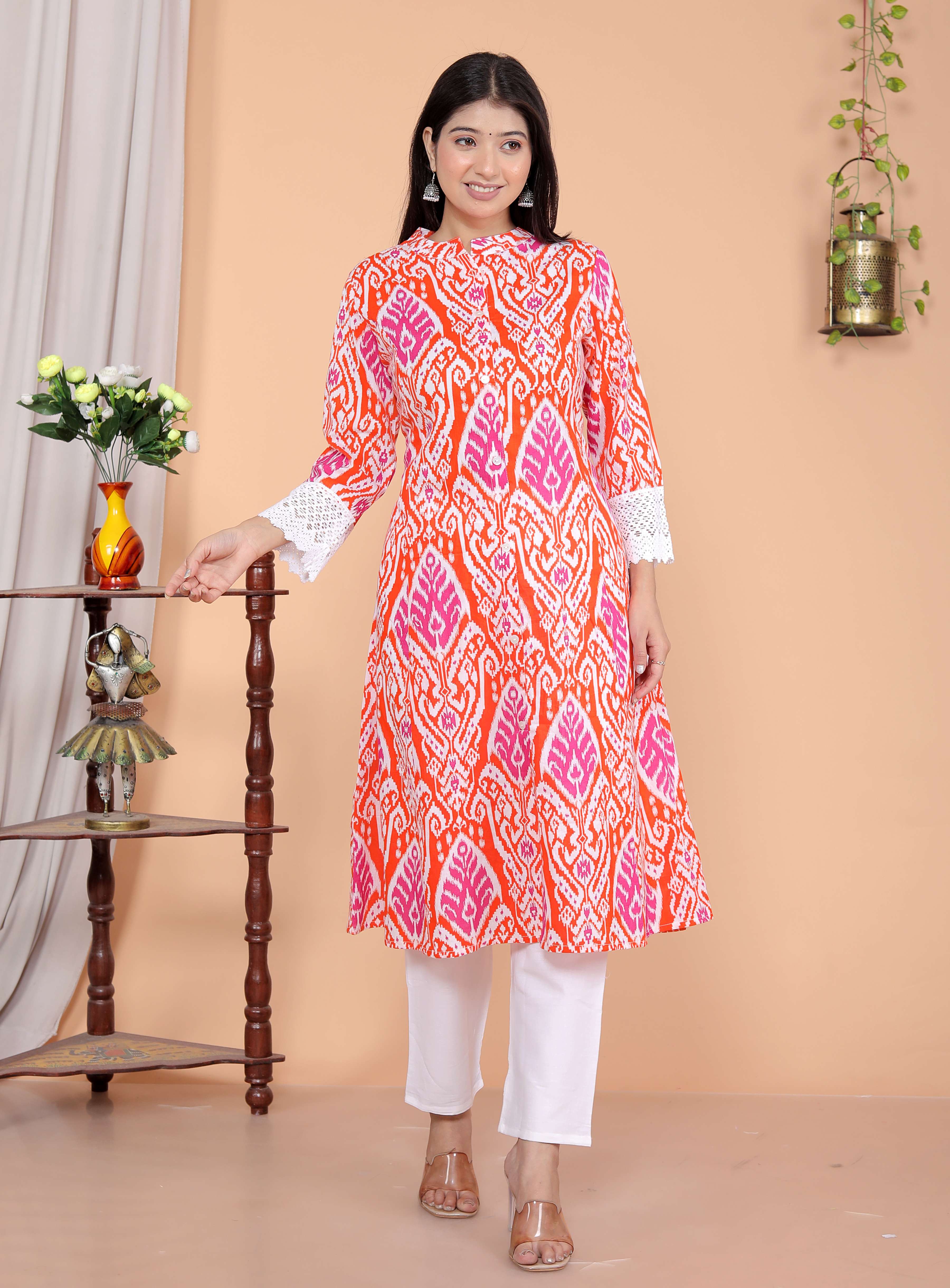 Women's Cotton Printed Mandarin Collar A-Line Kurti with Pant (Orange)