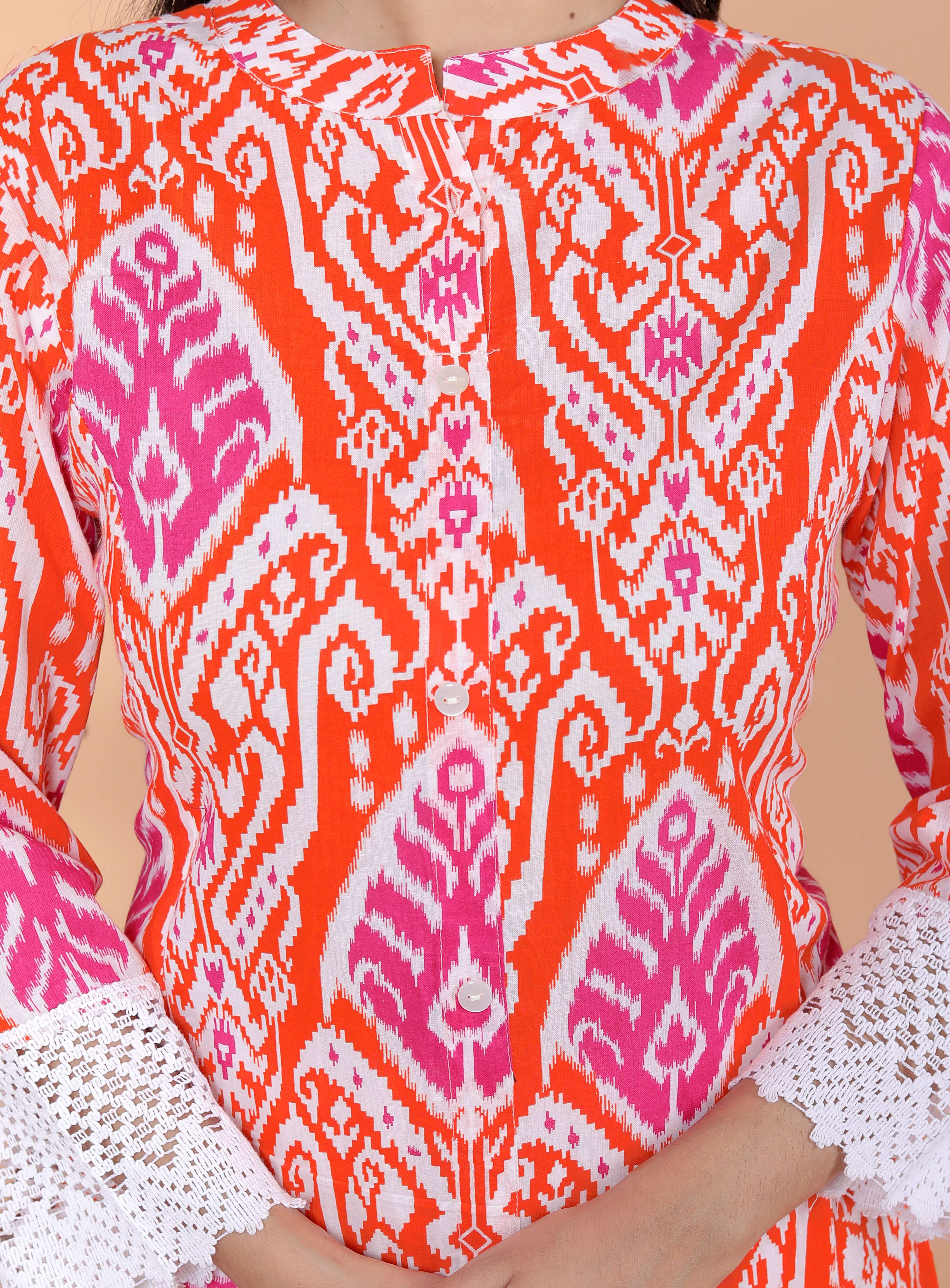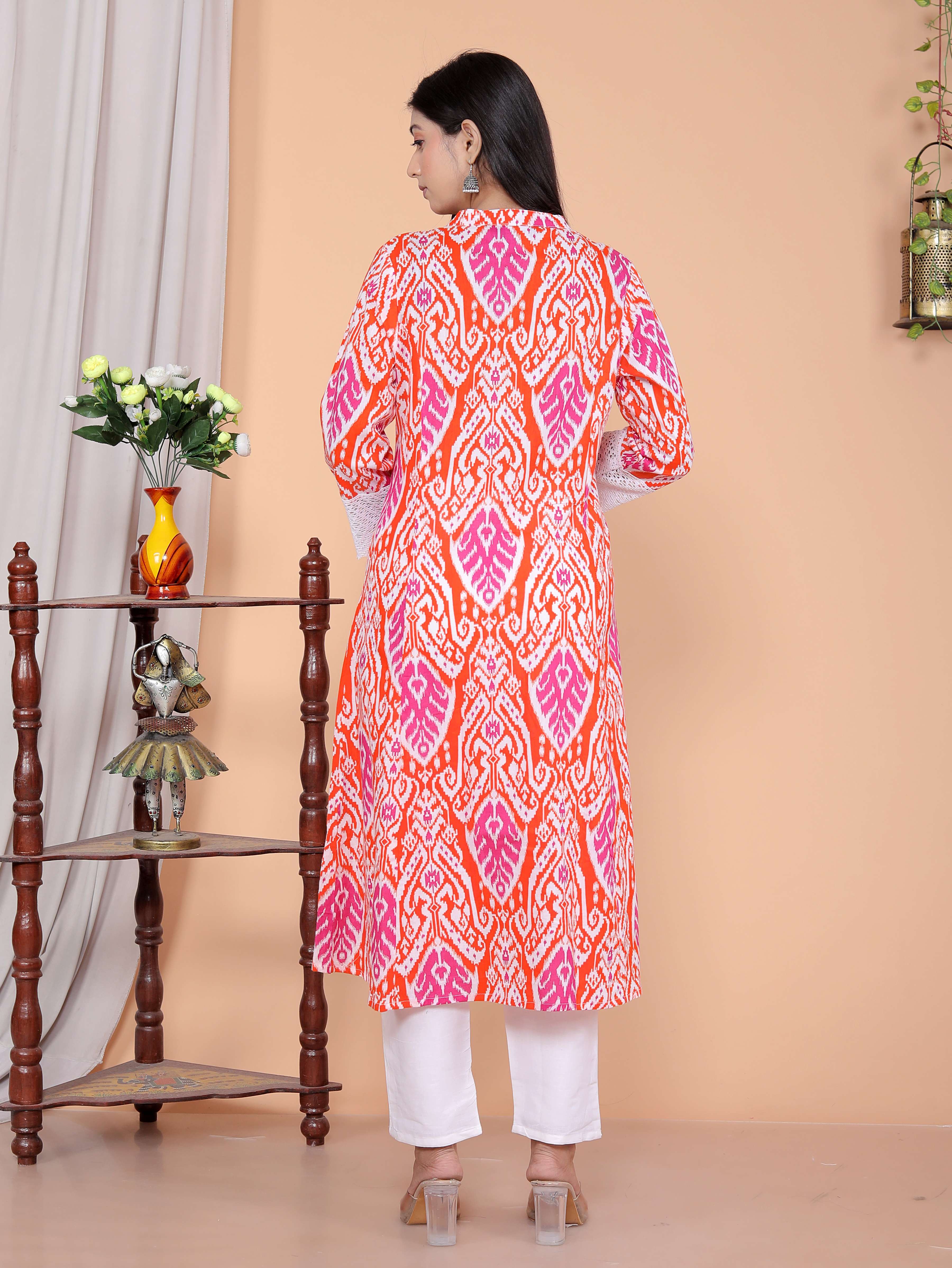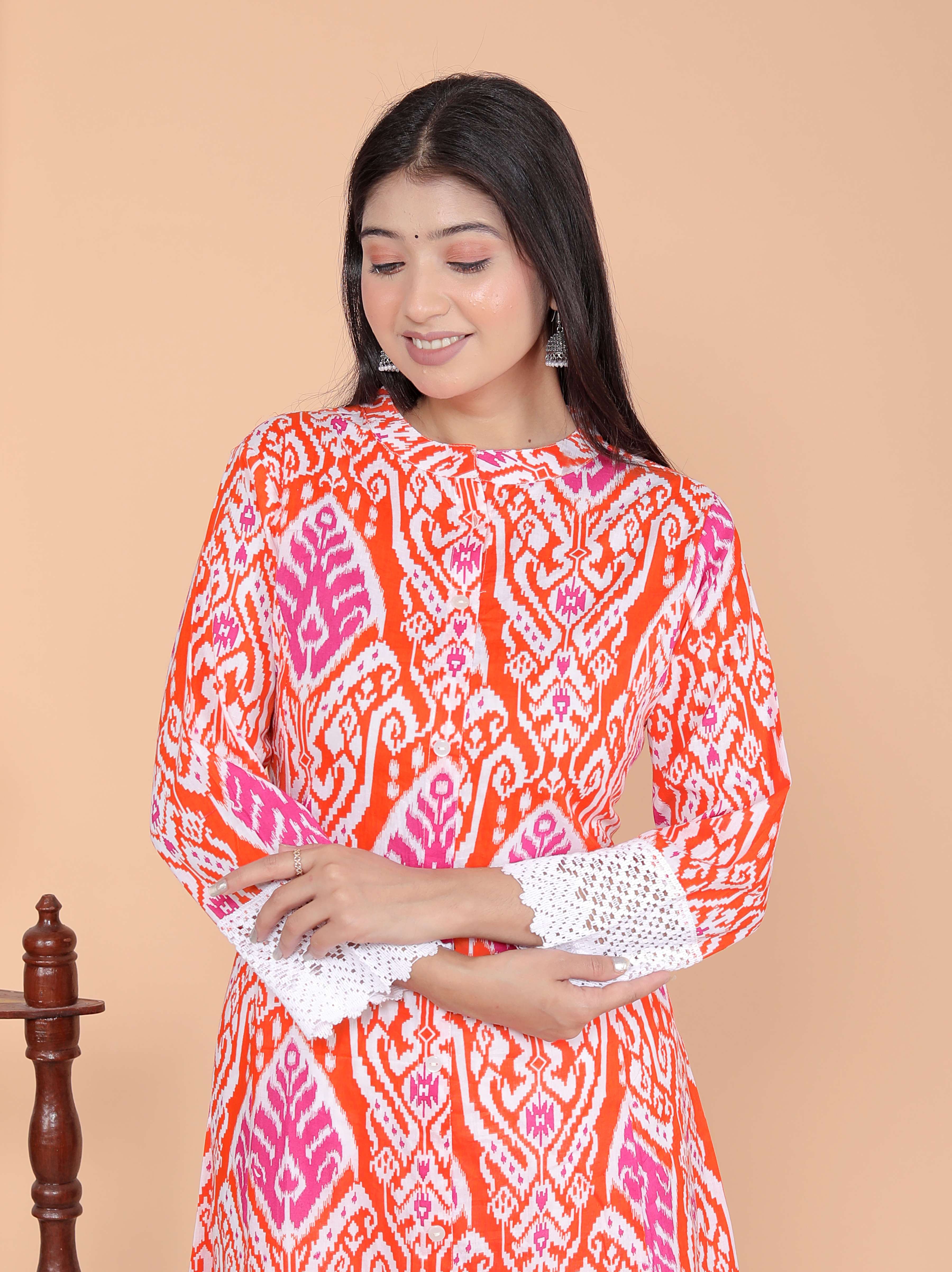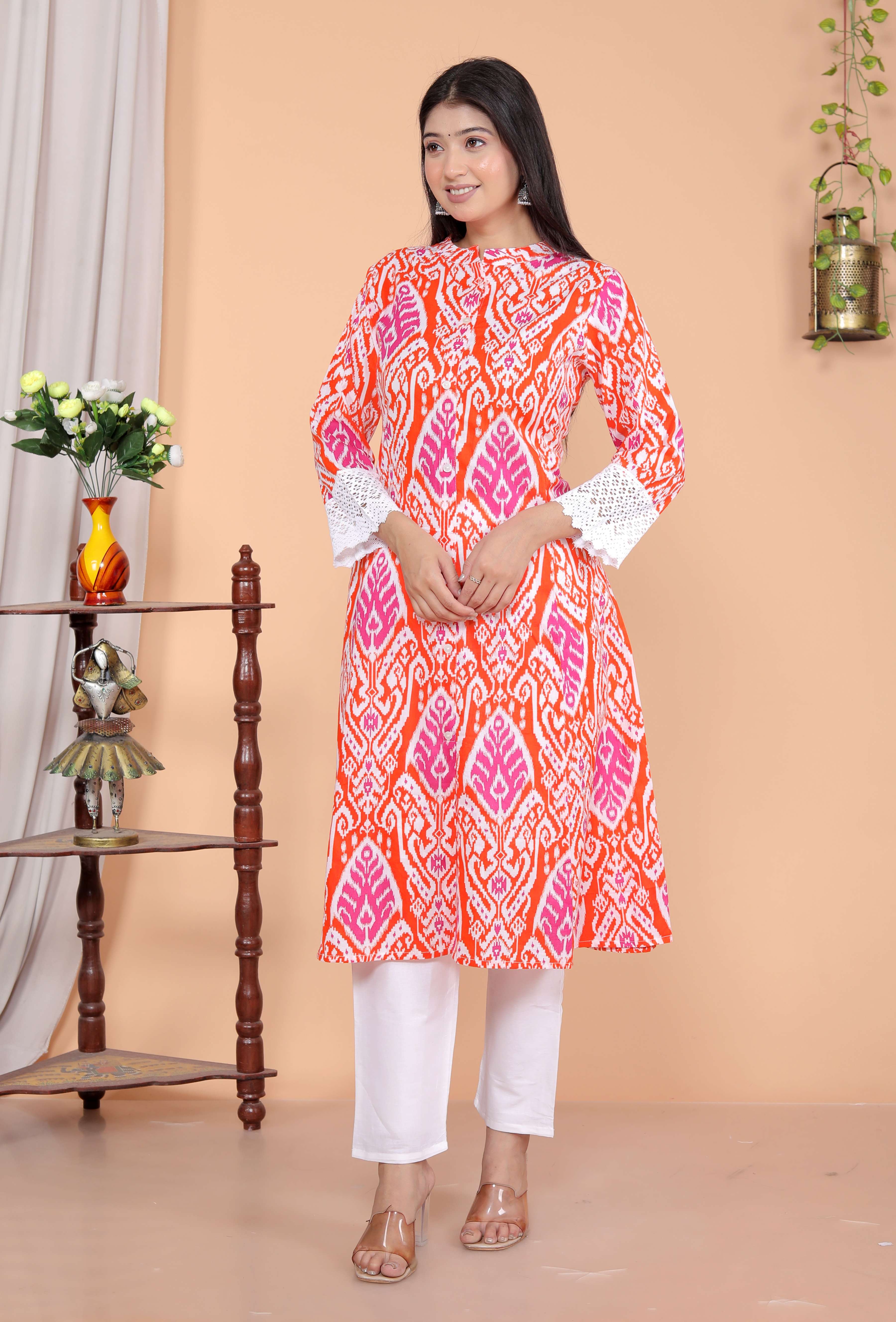 Women's Cotton Printed Mandarin Collar A-Line Kurti with Pant (Orange)