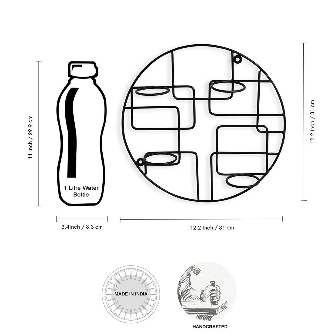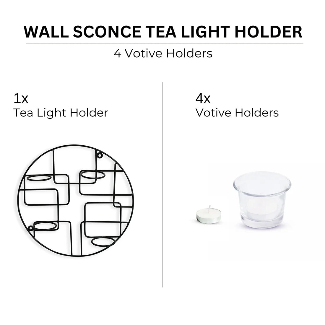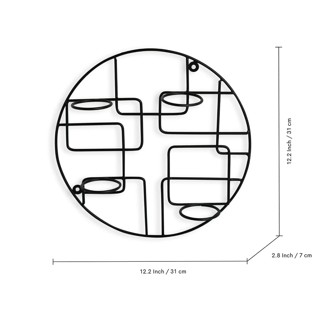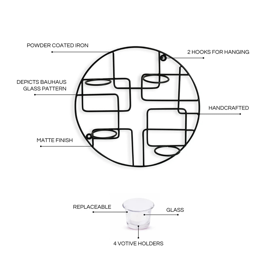 Celebrate the elegance of modern design with the ‘Bauhaus Glass’ wall tea light holder. Inspired by the iconic Bauhaus glass pattern, this round wall frame handcrafted by skilled Indian artisans blends geometry, minimalism, and utility into a striking piece of décor. The frame, made of sturdy iron and finished in matte black, comes with 4 replaceable glass votive holders and 4 tea-light candles.