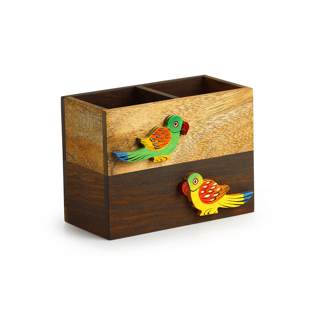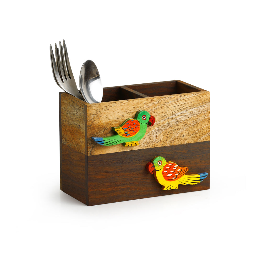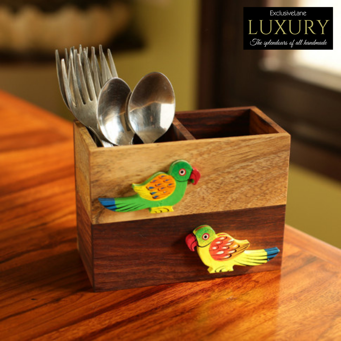Beautifully handcrafted in two different kinds of wood by craftspeople from the interiors of India, €˜Birds Of A Feather€™ is a rectangular cutlery holder with two separate in-built compartments, inspired from the astonishingly beautiful and surprisingly smart parakeets; an indigenous Indian bird species that has always been delightful both in the wild and as companions to many. The fusion of mango wood and sheesham wood is visible clearly because of the distinct natural colour of each, which is complimented amazingly by the bright little multicoloured parakeets hand painted on wood, who seem completely at home on the holder. The compact design, fine finishing of woods and simple utility of organising cutlery, makes €˜Birds Of A Feather€™ an ethnic Indian tale handcrafted with love, bringing a touch of life, deep within the Indian forests to organise and add art to your table top and living spaces.