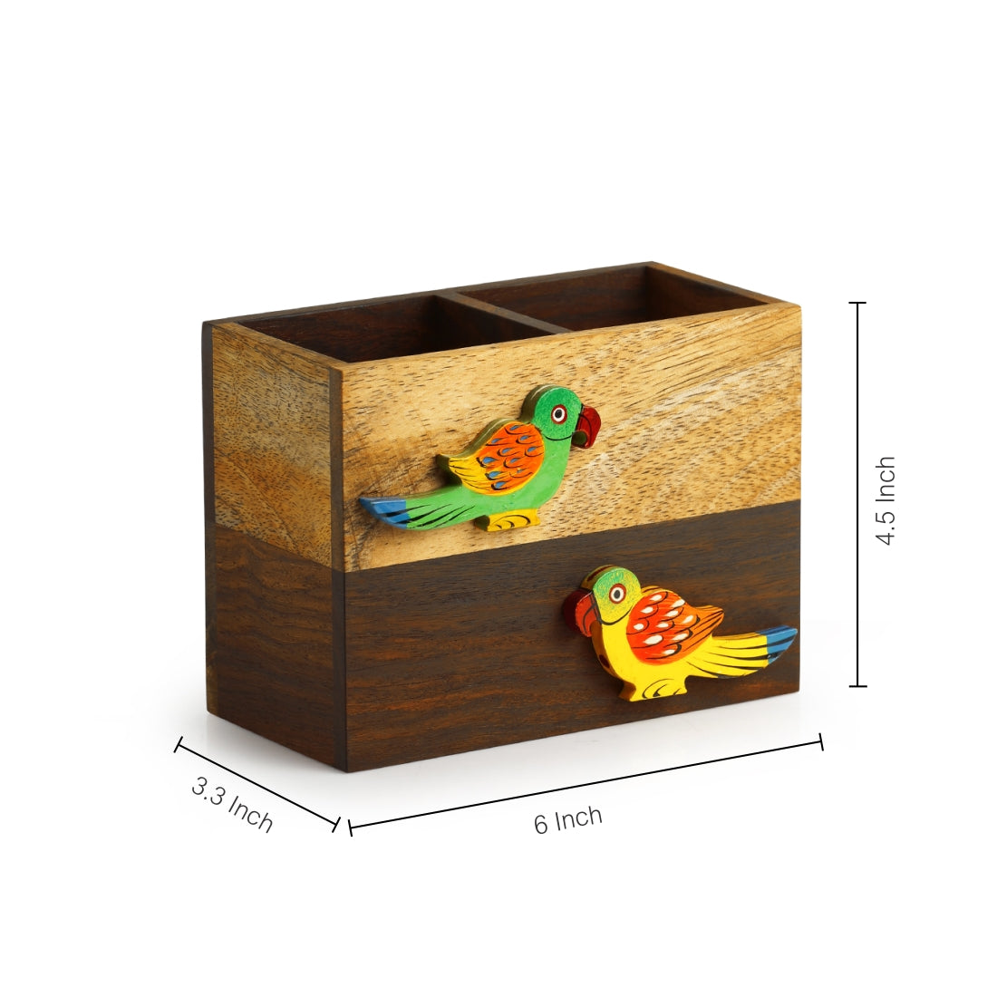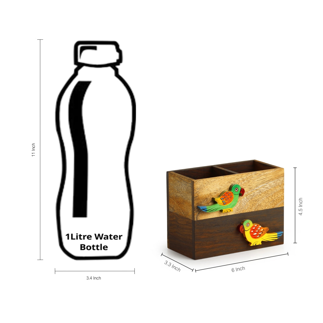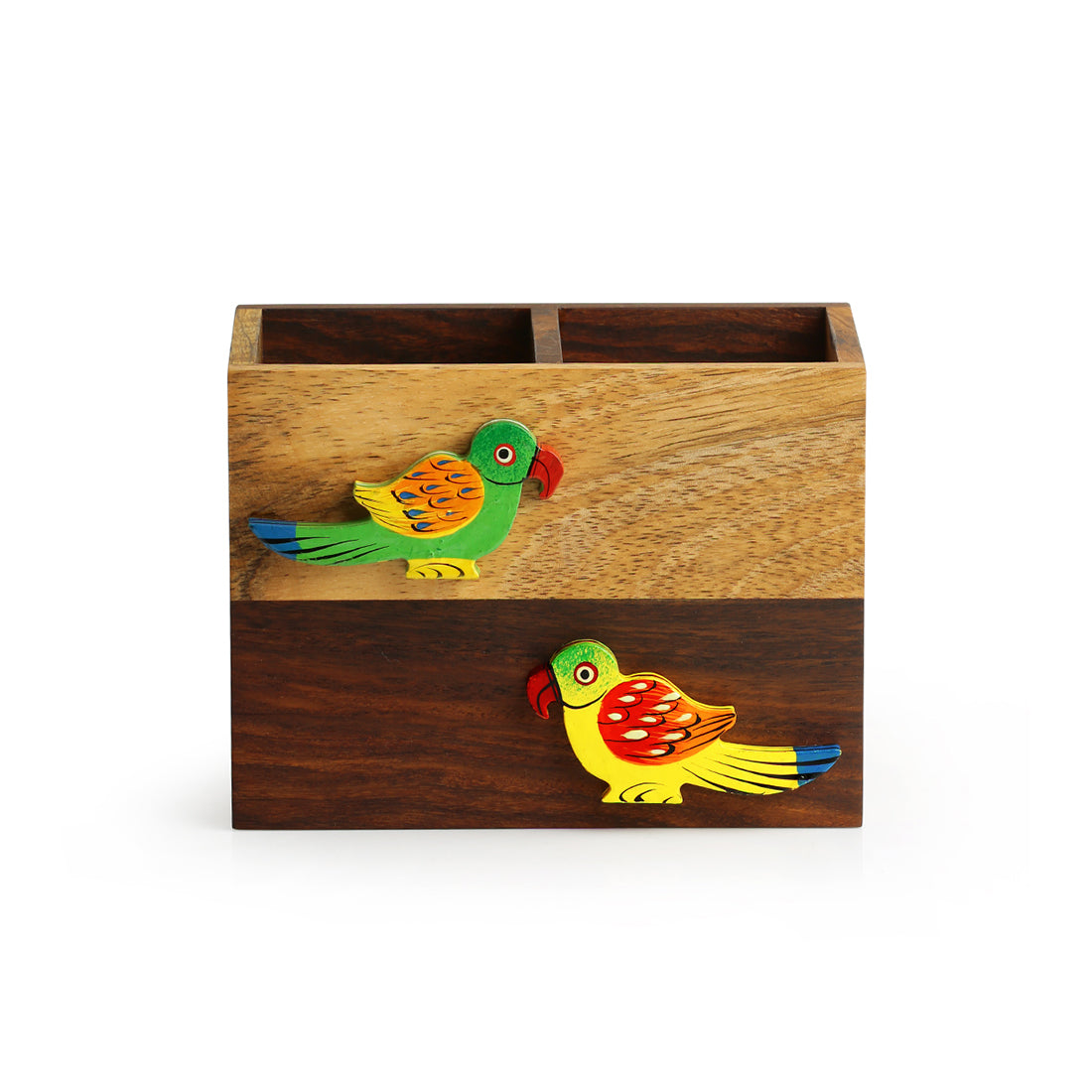 Beautifully handcrafted in two different kinds of wood by craftspeople from the interiors of India, €˜Birds Of A Feather€™ is a rectangular cutlery holder with two separate in-built compartments, inspired from the astonishingly beautiful and surprisingly smart parakeets; an indigenous Indian bird species that has always been delightful both in the wild and as companions to many. The fusion of mango wood and sheesham wood is visible clearly because of the distinct natural colour of each, which is complimented amazingly by the bright little multicoloured parakeets hand painted on wood, who seem completely at home on the holder. The compact design, fine finishing of woods and simple utility of organising cutlery, makes €˜Birds Of A Feather€™ an ethnic Indian tale handcrafted with love, bringing a touch of life, deep within the Indian forests to organise and add art to your table top and living spaces.