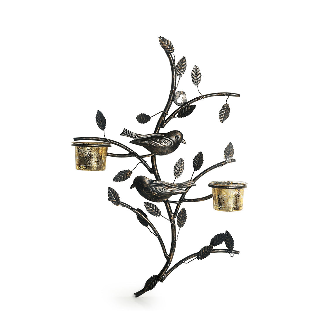 The 'Birds On Branch' is a wall tea-light holder set comprising of 1 tea-light wall frame handcrafted in iron which comes with 2 bucket-shaped glass holders covered with golden foils on the outside containing 1 tea-light candle each. This black coloured holder set is handcrafted with utmost elegance by our skilled artisans depicting resting birds on a tree branch with a coating of powder giving it a matte finish. The 'Birds On Branch' as an exclusive home item is essential to be used for lighting up your home or office interiors which can also be used as wall decor and can help in enriching your warm and cosy living spaces with its alluring, sophisticated, beautiful and exquisite look.