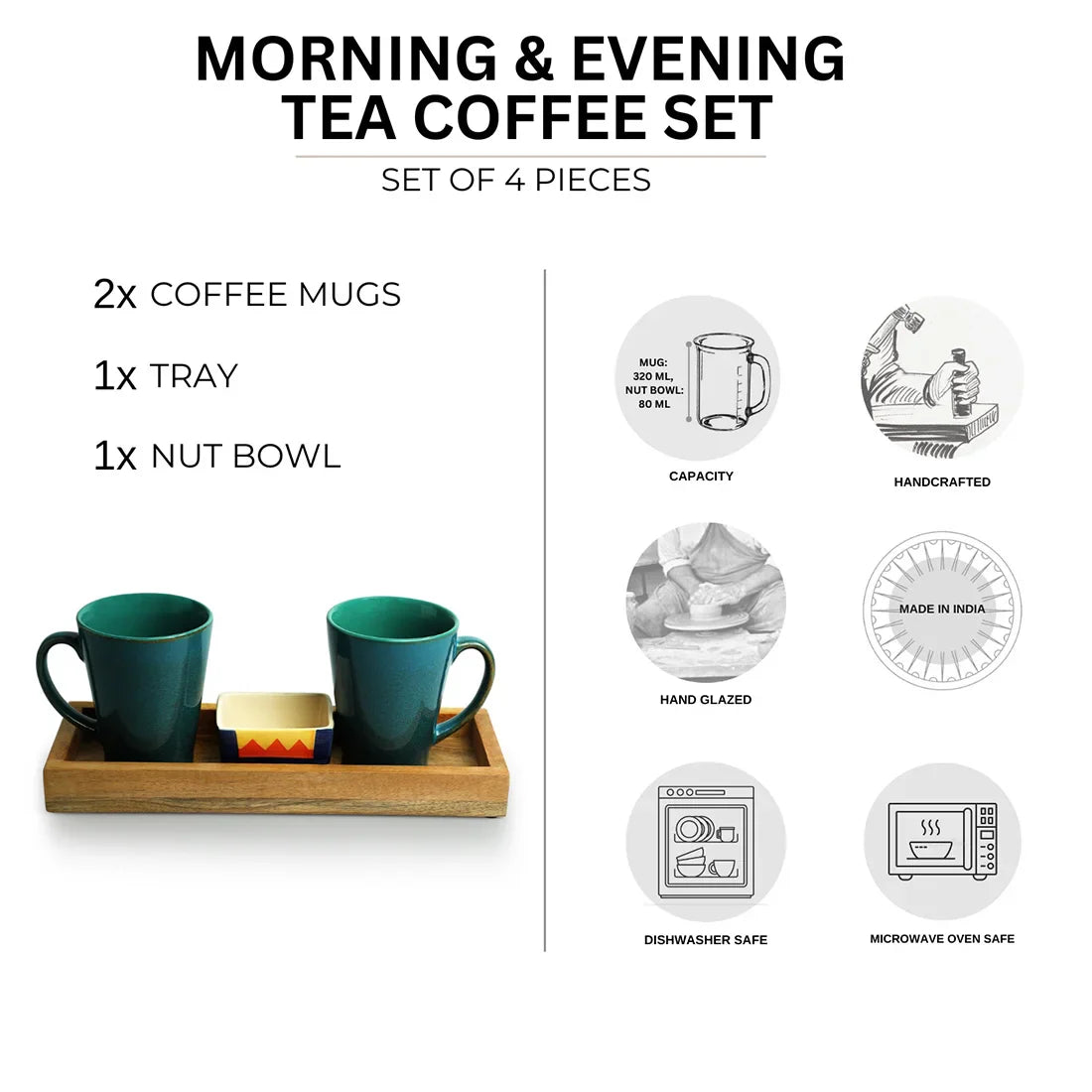 The 'Blues Of Sky-Geometric Landscape' is a set of 2 tea & coffee mugs, 1 nut bowl & 1 tray. The coffee mugs & nut bowl are handglazed & hand-painted with geometrical motifs and have a volume of 320 ml & 80 ml respectively. The coffee mugs & nut bowl are made in ceramic and the tray is handcrafted in mango wood. The coffee mugs & nut bowl are microwave and dishwasher safe. Handcrafted with so much elegance by our artisans, this exclusive set of tableware can also be used as an ideal gifting option for house-warming parties and festive seasons.