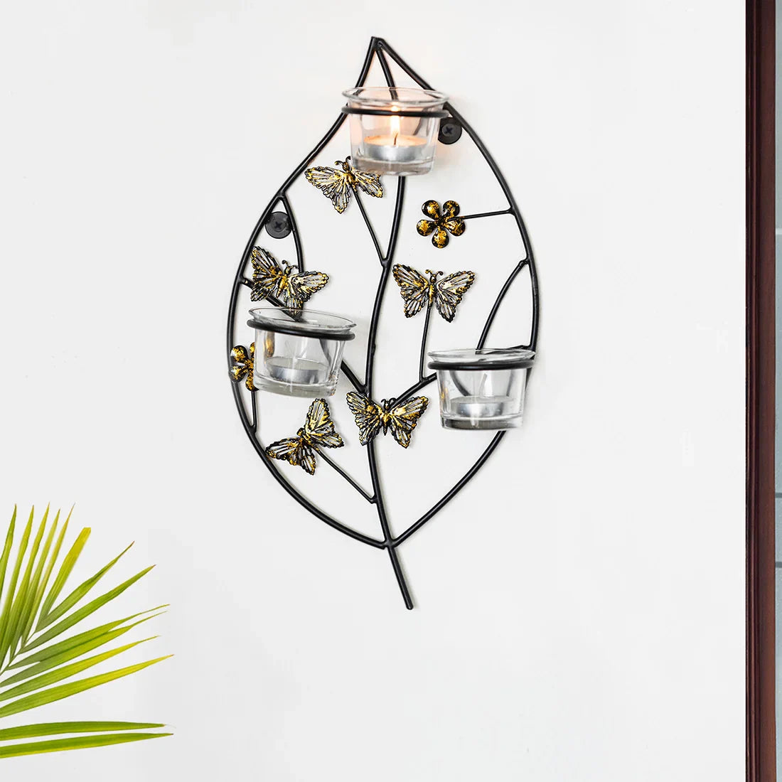 Transform your walls with the charm of nature using the ‘Butterflies & Leaf’ wall tea light holder. Handcrafted by skilled Indian artisans, this iron piece is shaped like a graceful leaf, beautifully adorned with hand-painted butterfly motifs in golden accents. It holds 3 glass votive holders with replaceable tea-light candles, combining delicate artistry with warm illumination.