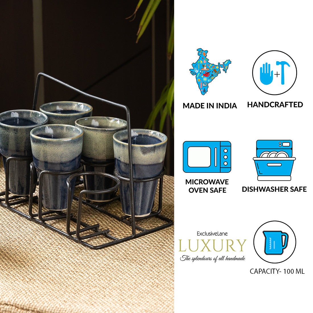 This product known as 'Buzzing Blues' consists of tea glasses with an iron holder and is a part of the 'Coffee Chronicles' collection. Gorgeously hand-made by Indian artisans, this tableware product is inspired by the serenity and peace of the southern coastal areas. The faded shades are an add-on to depict the soothing hues profound in these areas.