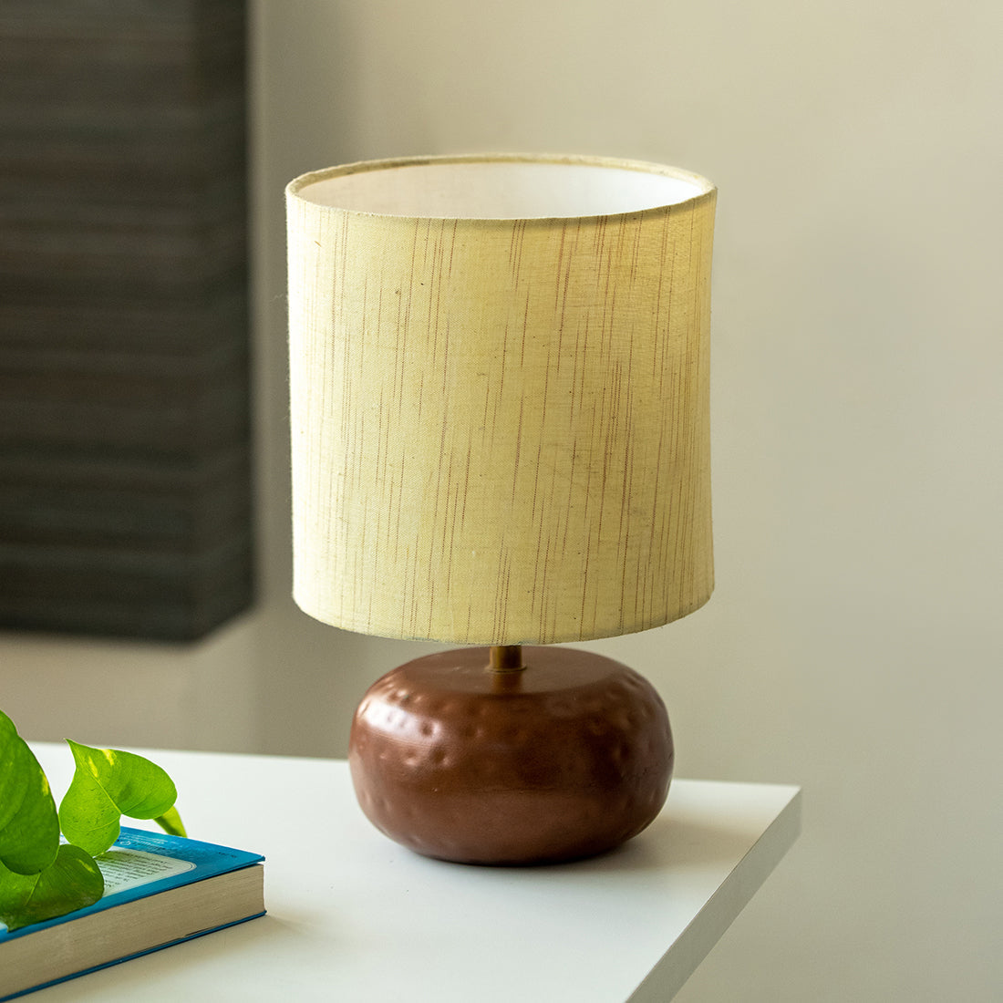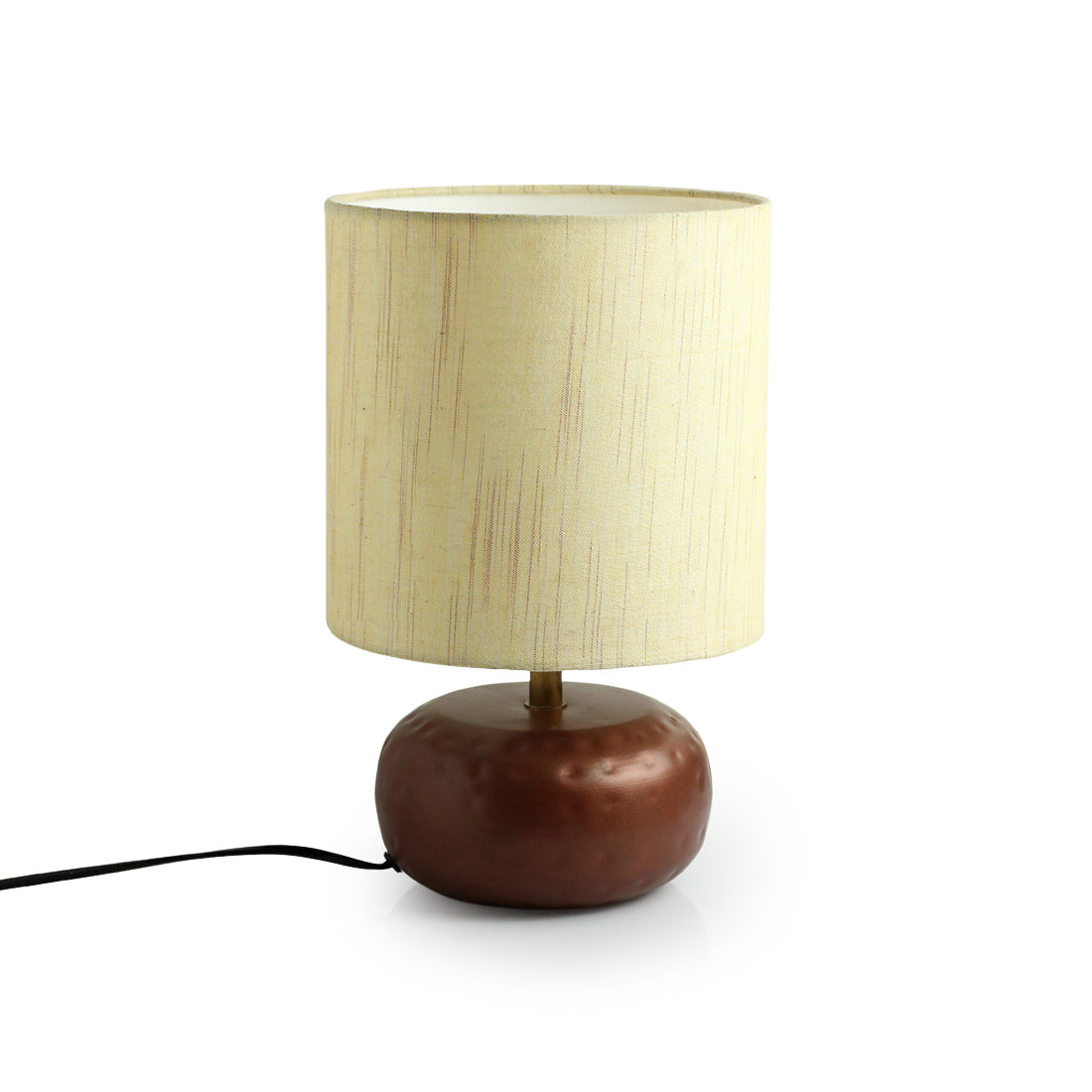 The 'Chestnut Hammered' is inspired from hand-hammered surface technique used in metal artworks combined with different tints and tones of chestnut. The cotton fabric on this lamp shade is perfect for the contemporary home setting and adds an interesting contrast to the traditional home decor. Handcrafted by Indian artisans, and perfect to add a modern touch to your home, the elegant colors with designer lamp made of iron with cotton cloth wrapped over polyvinyl makes this lamp a classic lighting solution.