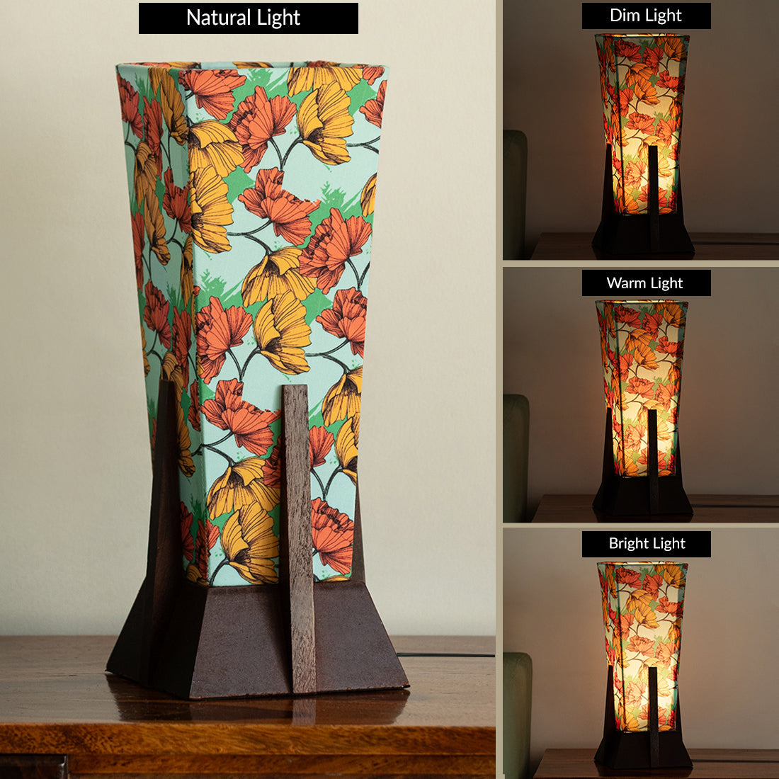 - Depicts a table lamp of printed lamp shade having flower motifs with handcrafted wood base.