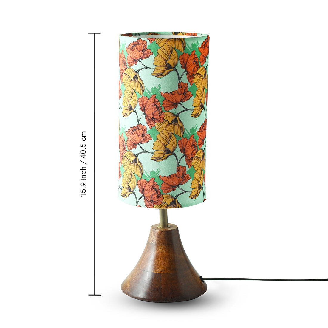 - Depicts a table lamp of printed lamp shade having flower motifs with handcrafted wood base.