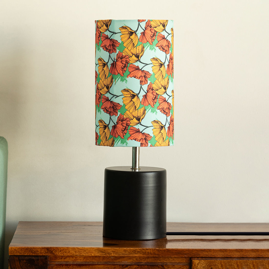- Depicts a table lamp with printed lamp shade having flower motifs & handcrafted Metal Cylindrical base.