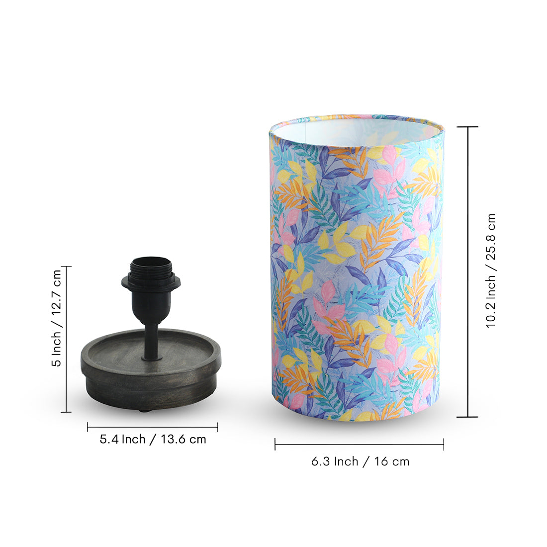 - Depicts a table lamp of printed lamp shade having leaf motifs with handcrafted wood base.