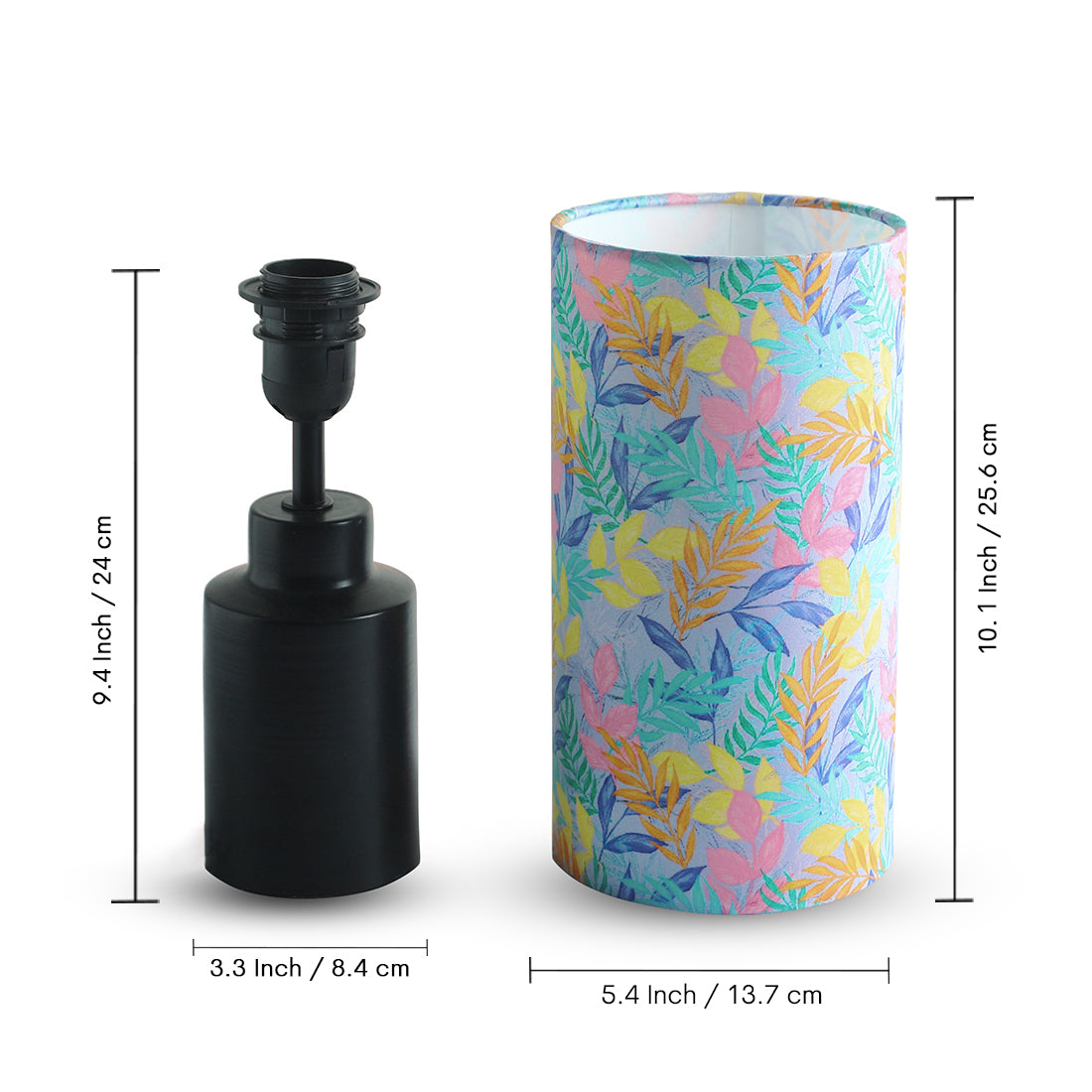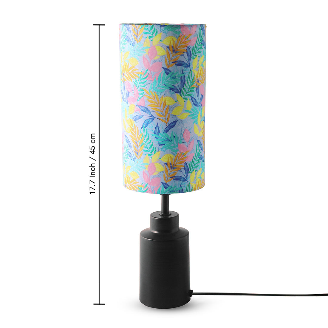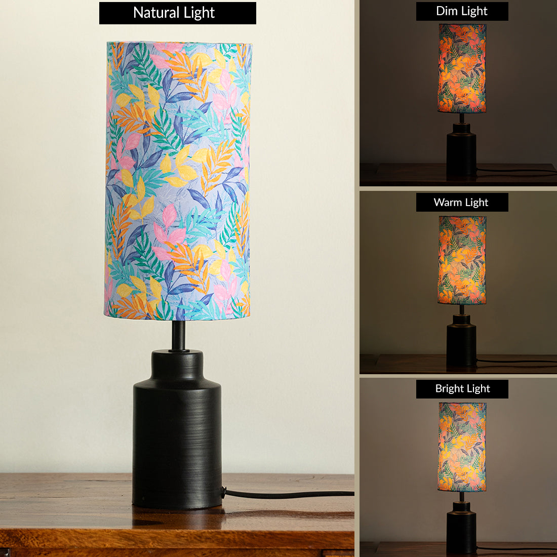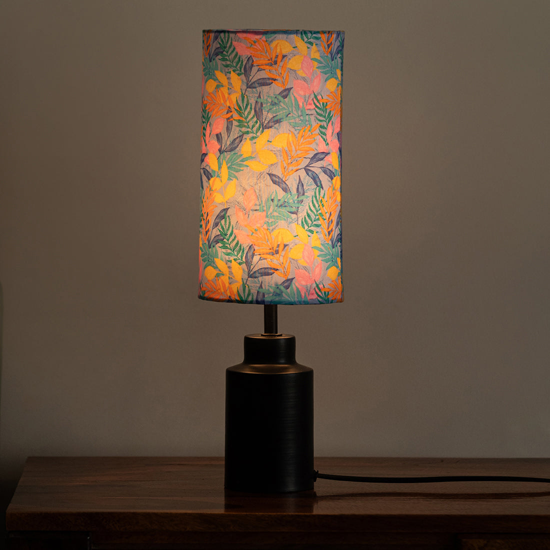- Depicts a table lamp with printed lamp shade having leaf motifs handcrafted Metal Cylindrical base.