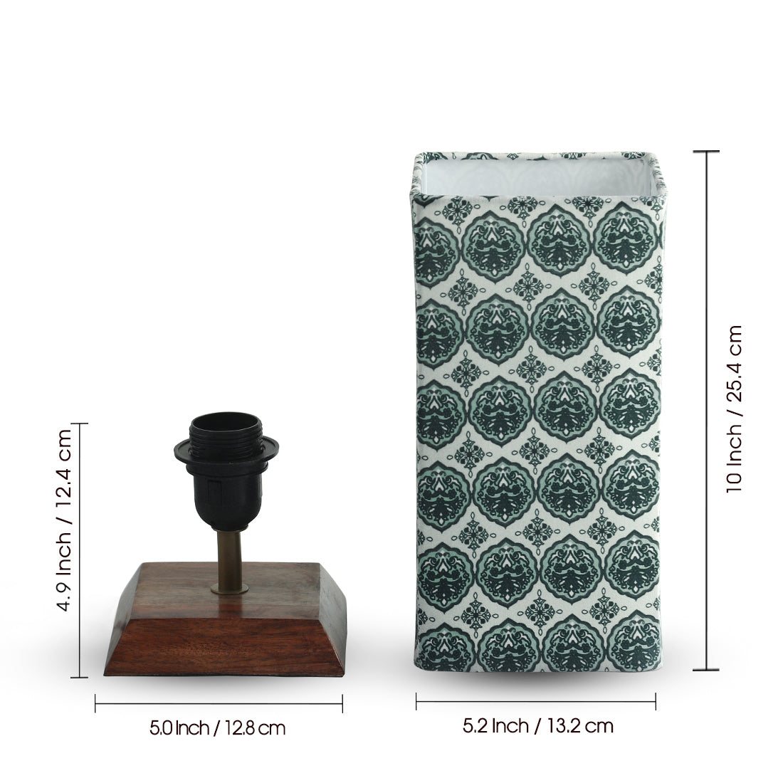 TOTAL: (L * W * H) = (13.2 * 13.2 * 33), SHADE: (L * W * H) = (13.2 * 13.2 * 25.4), BASE: (L * W * H) = (12.8 * 12.8 * 12.4) Cms