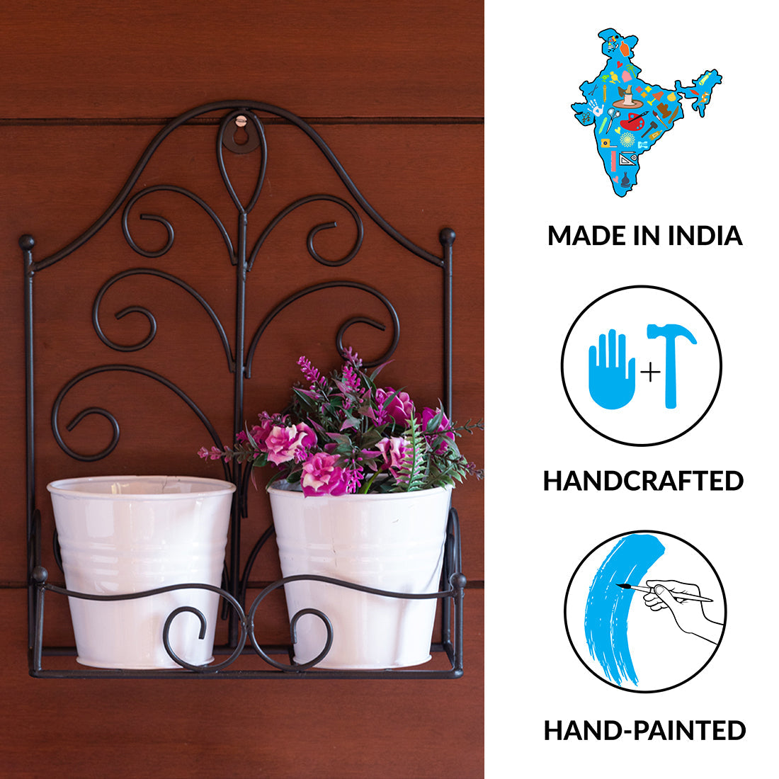 The Wall planters is a set of garden décor comprising of 2 Classic Bucket-shaped detachable planter pots with a unique shaped holder both made in iron to avoid rusting. Handcrafted with so much love and elegance by our artisans, this set of White coloured planters and Black coloured holder come in glossy and matte finish respectively. This ideal set of décorative planter pots for planting your favourite plants on the wall and also in the tables or floors after removing from the holder and for enriching the atmosphere of your dining room, balcony or office with vibrations of refreshment and serene experience as a wall décor.