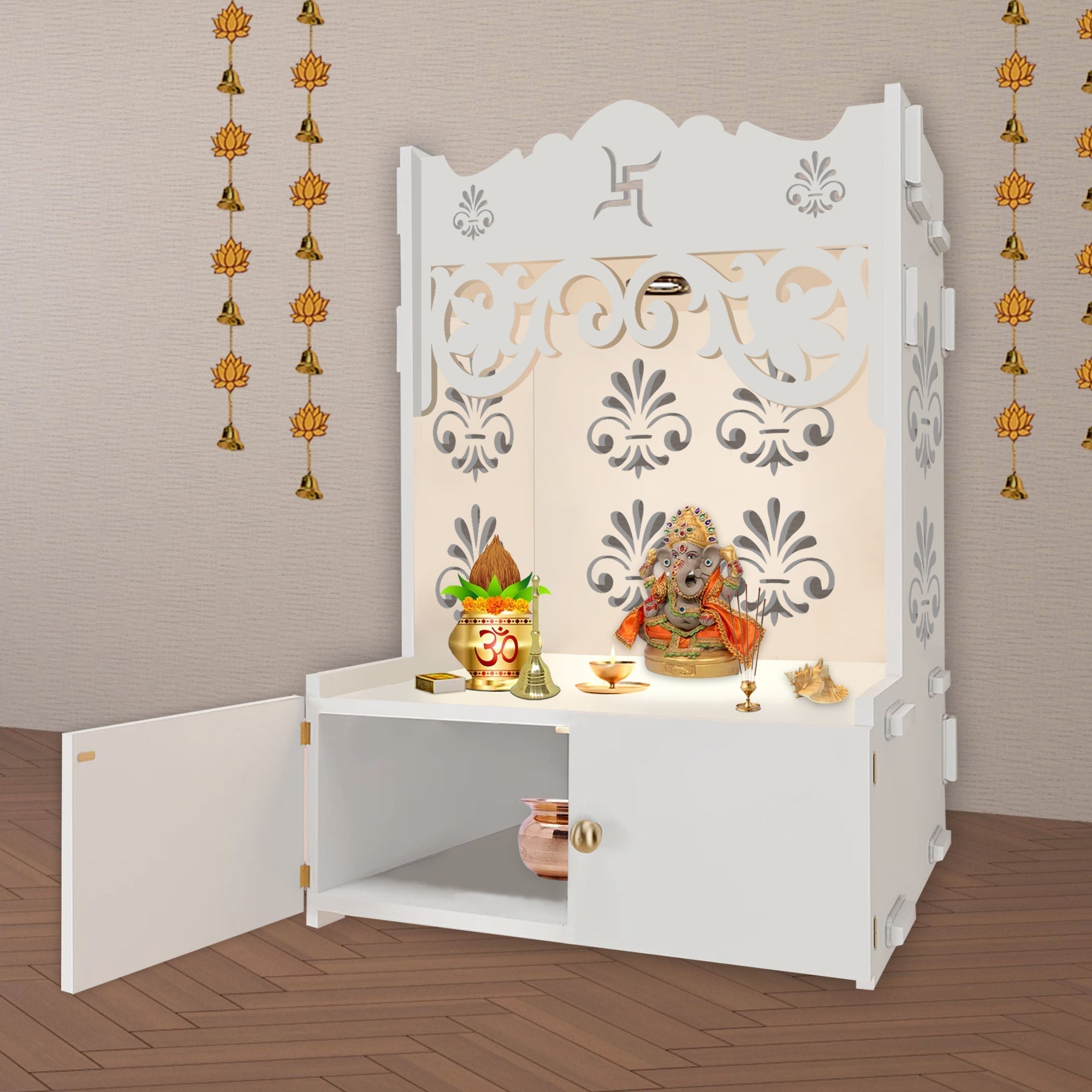Designer Om Chakra Brown MDF Wood Temple with Inbuilt Focus Light & Spacious Shelf, This product is made with perfect finish and premium quality. This Wall Shelf is exquisite shape Wall Shelf brings a unique décor for your bare walls with a great utility. Brilliant design, allowing light to fall on lower shelves also. It is matte finished with walnut color, made of imported Engineered wood. Ideal for living room, Bedroom. Can be used as Book shelf, wall shelf, Toy shelf, showcase etc. The package includes all accessories like nails, wall plugs, instructions needed to hang on wall and transforms the space around it.