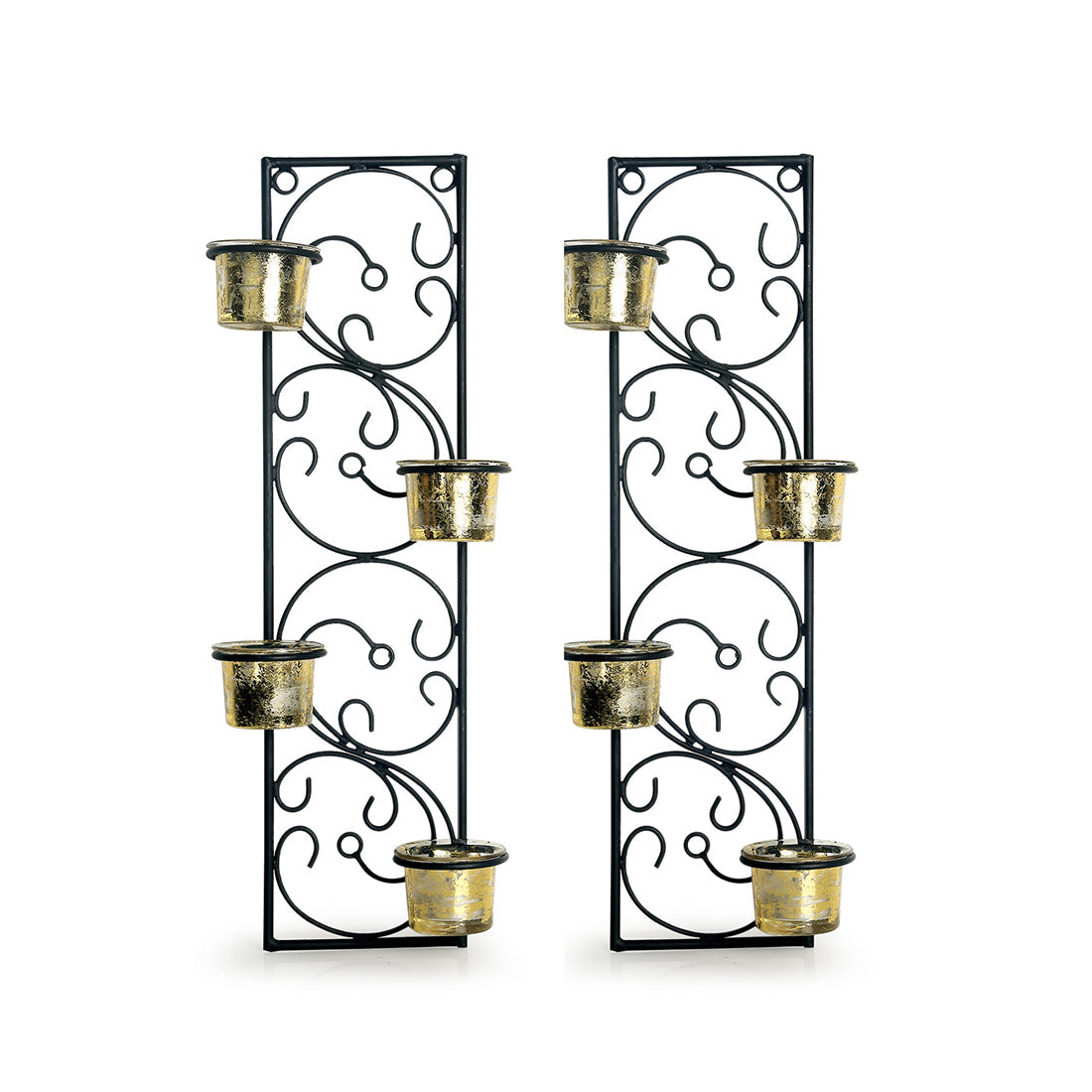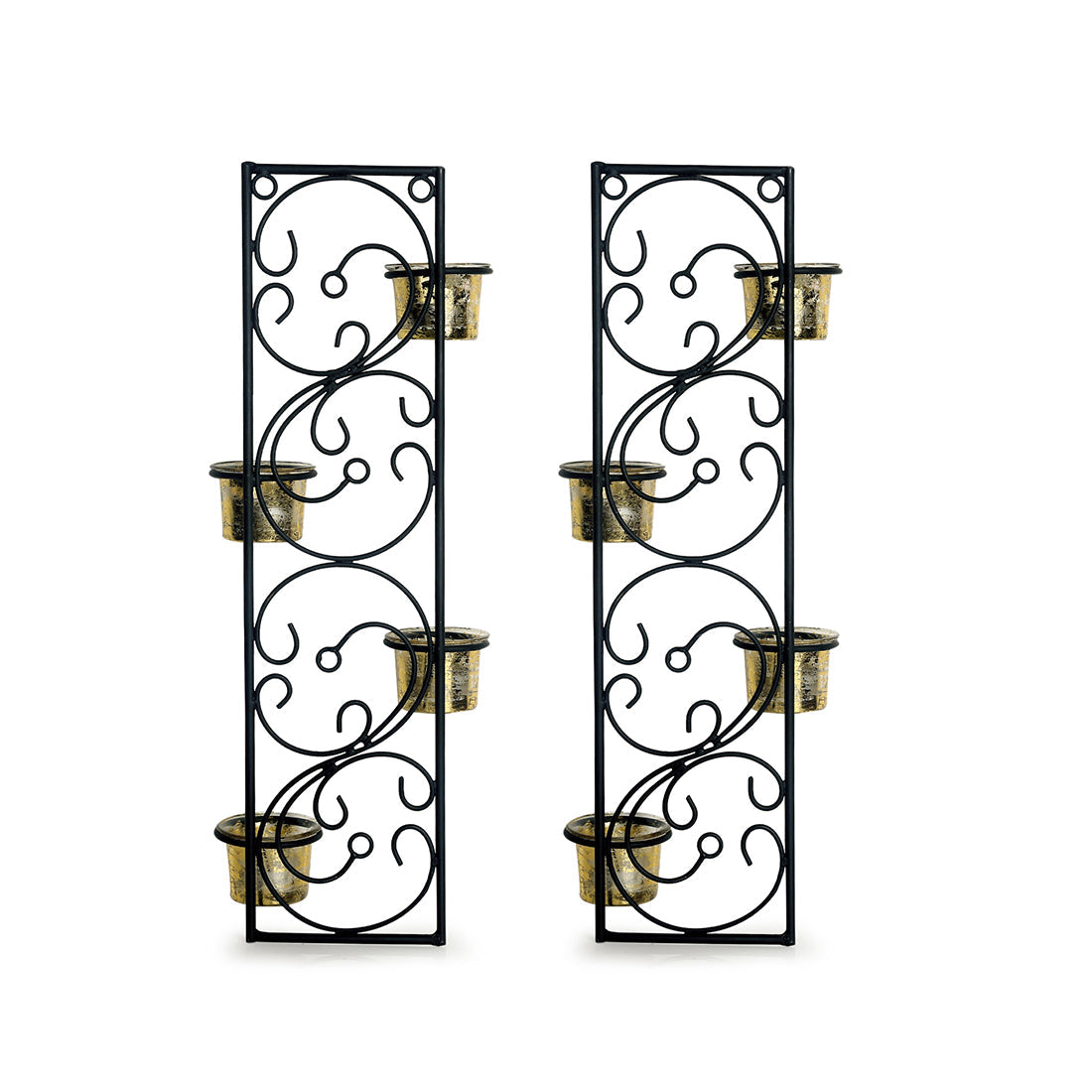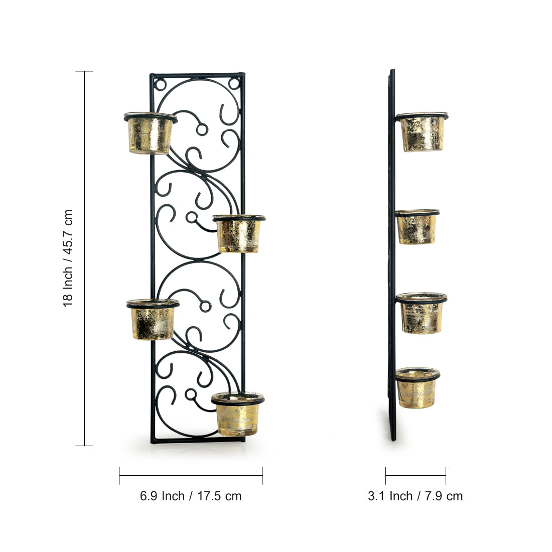 The 'Glowing Vines' is a wall tea-light holder set comprising of 2 rectangular-shaped tea-light wall frames handcrafted in iron which come with 4 bucket-shaped glass holders covered with golden foiling on the outside containing 1 tea-light candle each. This black coloured holder set is handcrafted with utmost elegance by our skilled artisans depicting tree vines with a coating of powder giving it a matte finish. The 'Glowing Vines' as an exclusive home item is essential to be used for lighting up your home or office interiors which can also be used as wall decor and can help in enriching your warm and cosy living spaces with its alluring, sophisticated, beautiful and exquisite look.