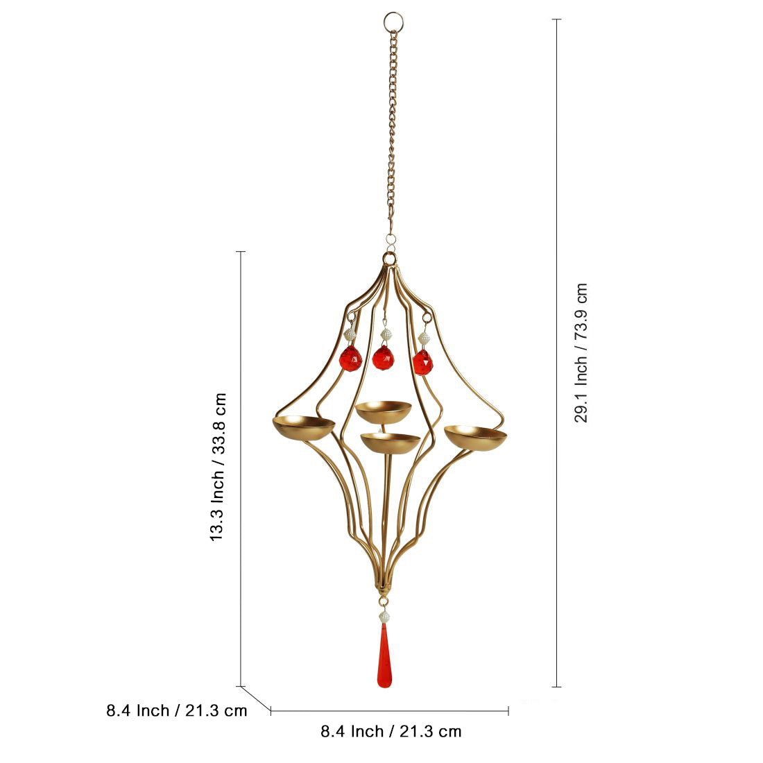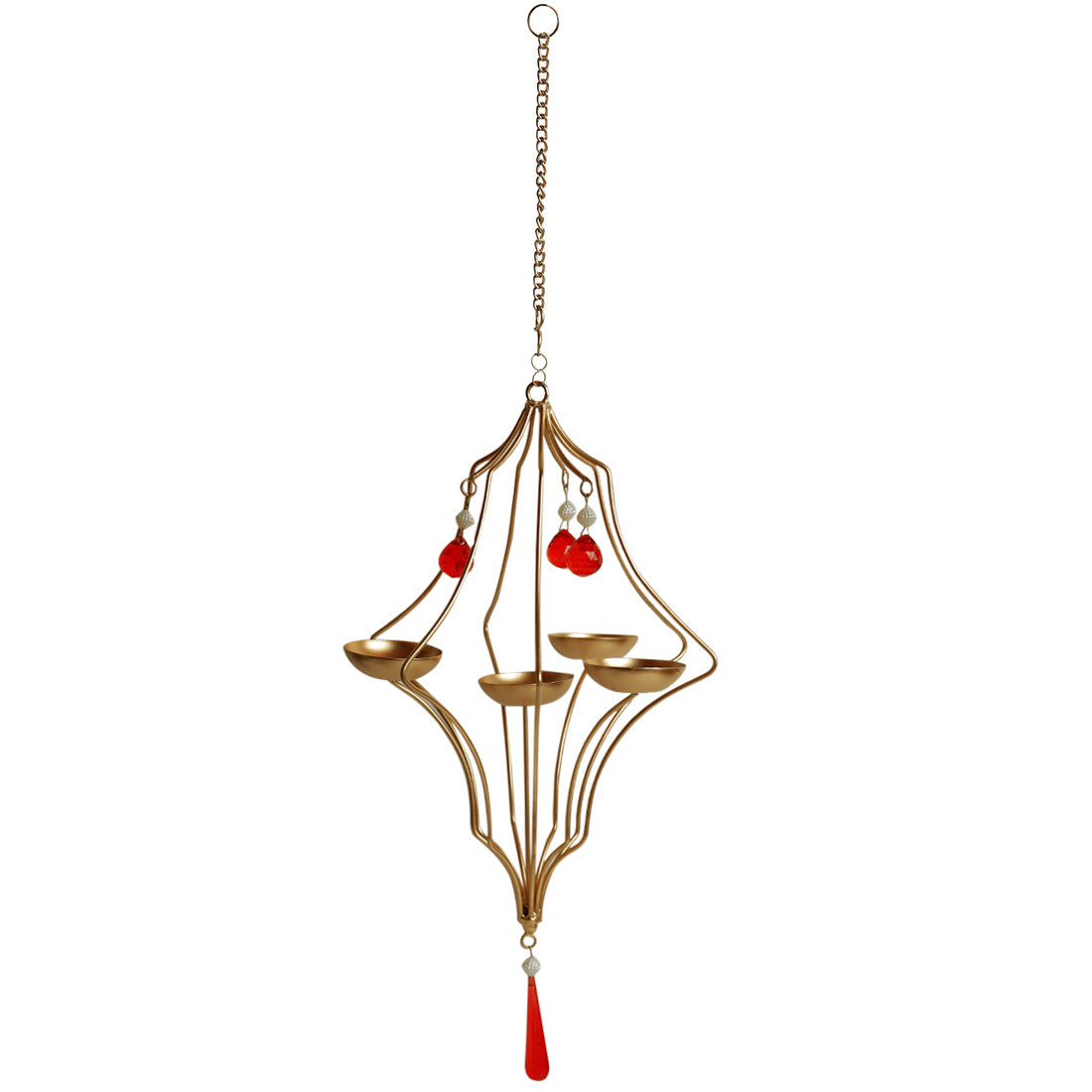 Bring an artistic glow to your home with the Golden Abstract Tea-Light Holder from our exclusive ‘The Illuminating Wonders’ collection. This stunning handcrafted decor piece combines golden ironwork with delicate white fiber beads and red glass drops to create a uniquely vibrant lighting accent. Whether you hang it in your living room, entrance, balcony, or gift it on a festive occasion, this piece is a radiant expression of tradition and design.