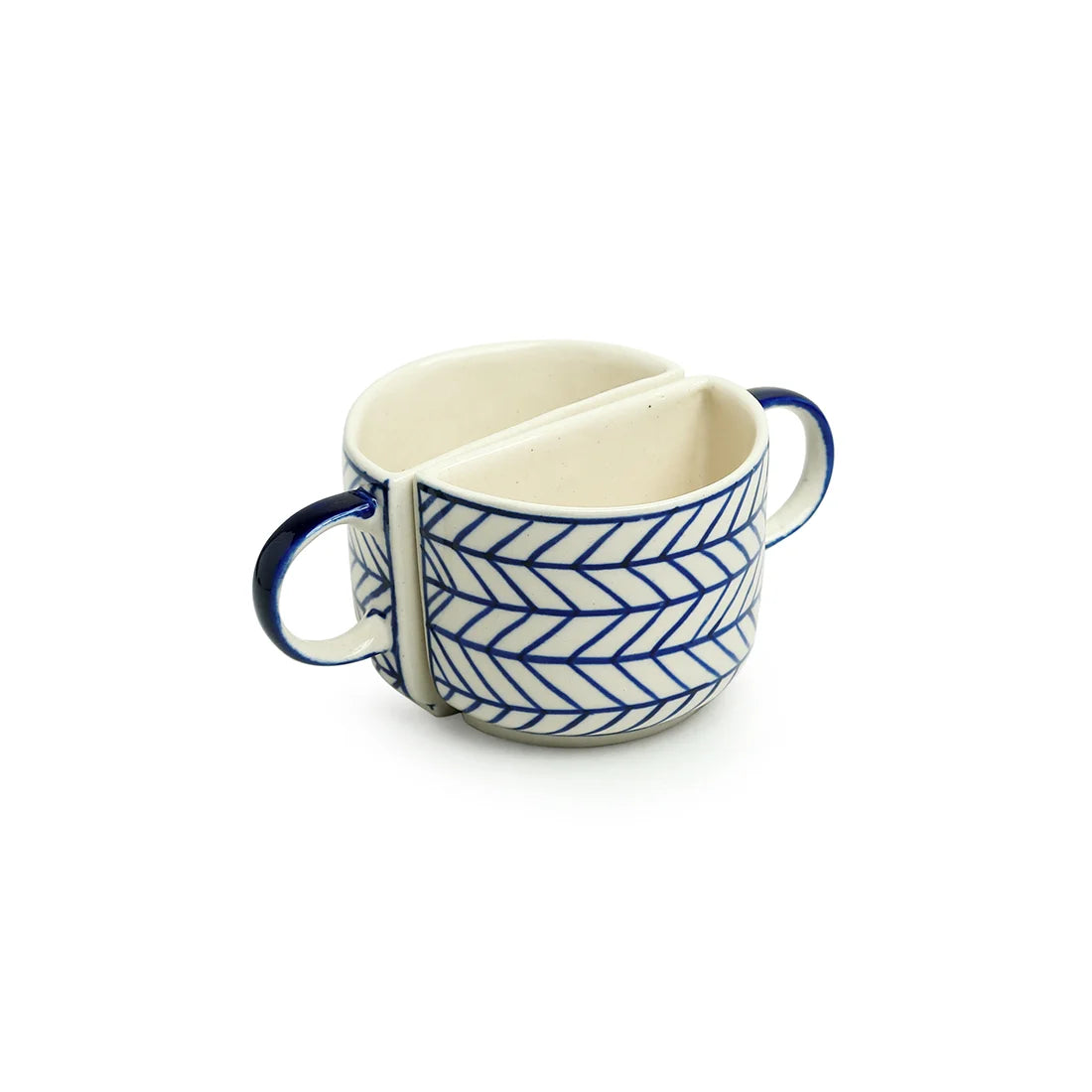 The 'Indigo Chevron' from the collection 'The Indigo Chevrons', is a set of 2 cups each of 200 ML, handmade & handglazed in Ceramic by skilled Indian artisans, ideal for having hot beverages like coffee, tea or milk with your loved ones. It can also be used to keep pens and other stationery items. The set comes in a unique half shape and is hand-painted with beautiful indigo blue colour on a base of white while depicting beautiful inverted Chevron pattern and comes in a glossy finish. This set is lead free as well as microwave and dishwasher safe