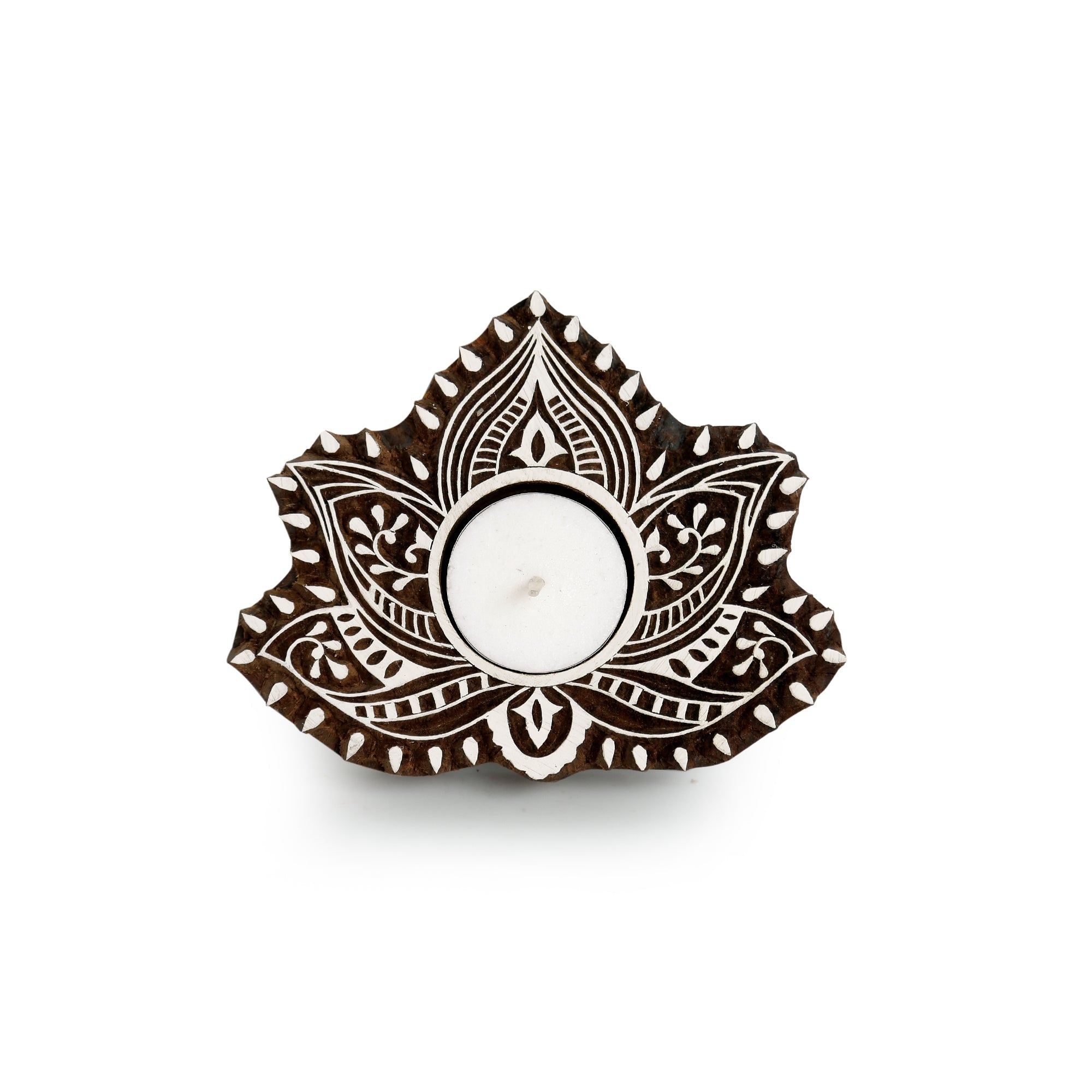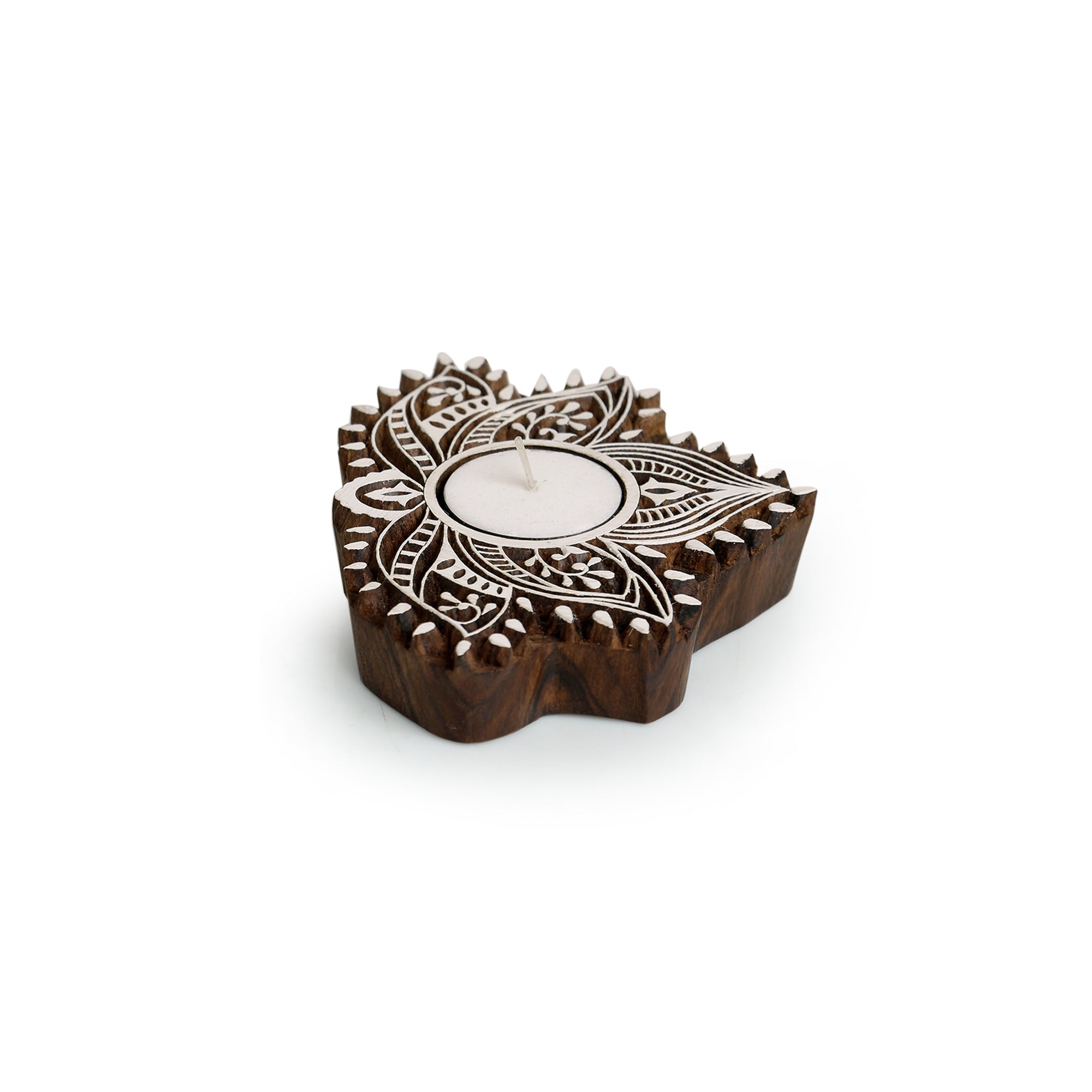 - This Sheesham Wooden Block Tea-Light Holder is Hand-Carved in the Shape of a Lotus Depicting Bagh Pattern.