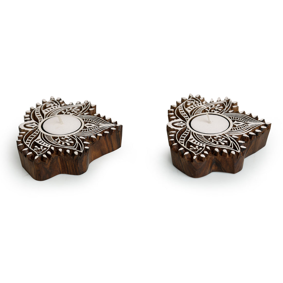 - These Sheesham Wooden Blocks Tea-Light Holders are Hand-Carved in the Shape of Lotuses Depicting Bagh Pattern.
