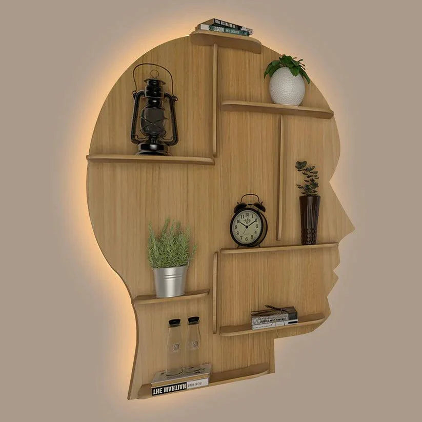 Man Backlit Designer Wooden Wall Shelf / Book Shelf, Light Oak Finish