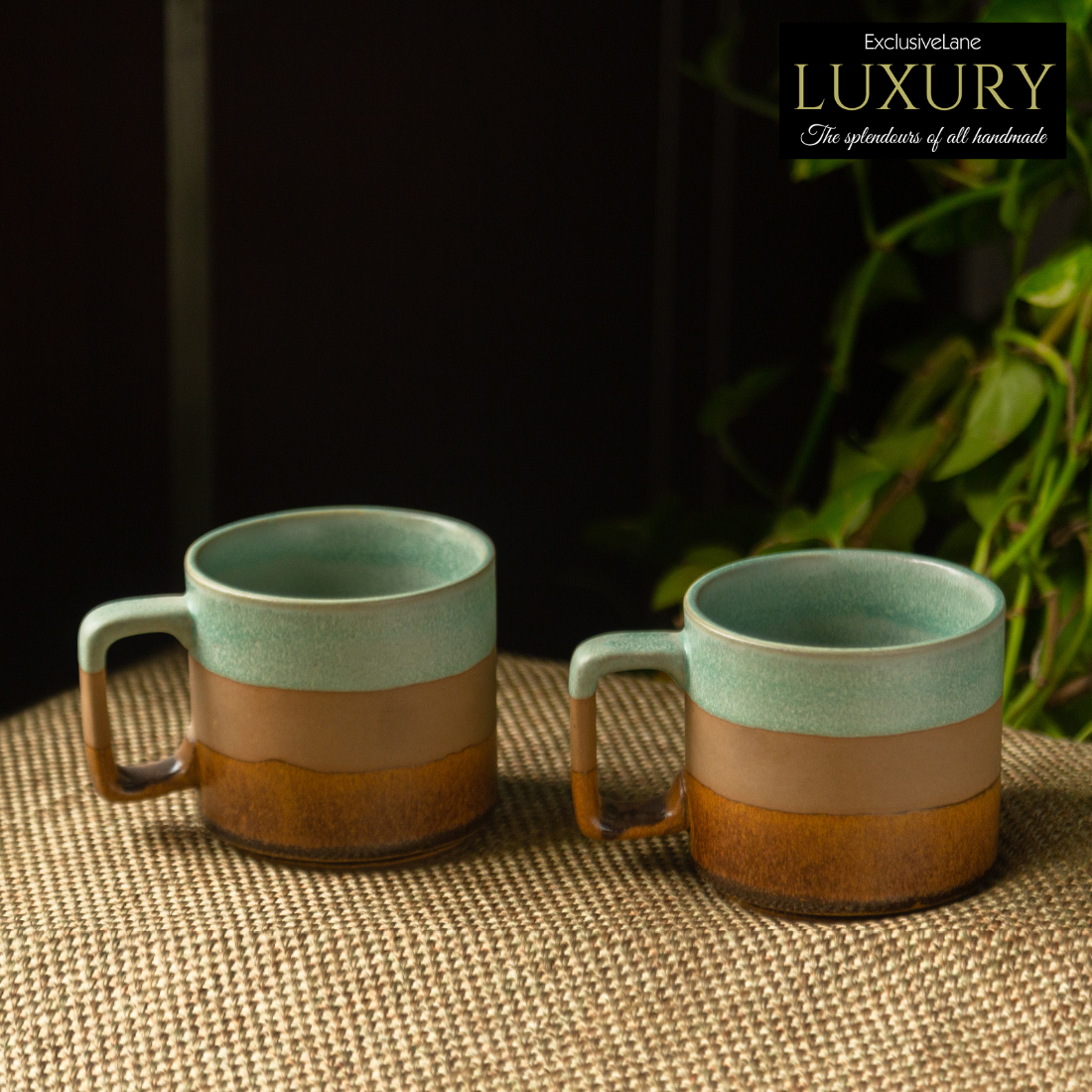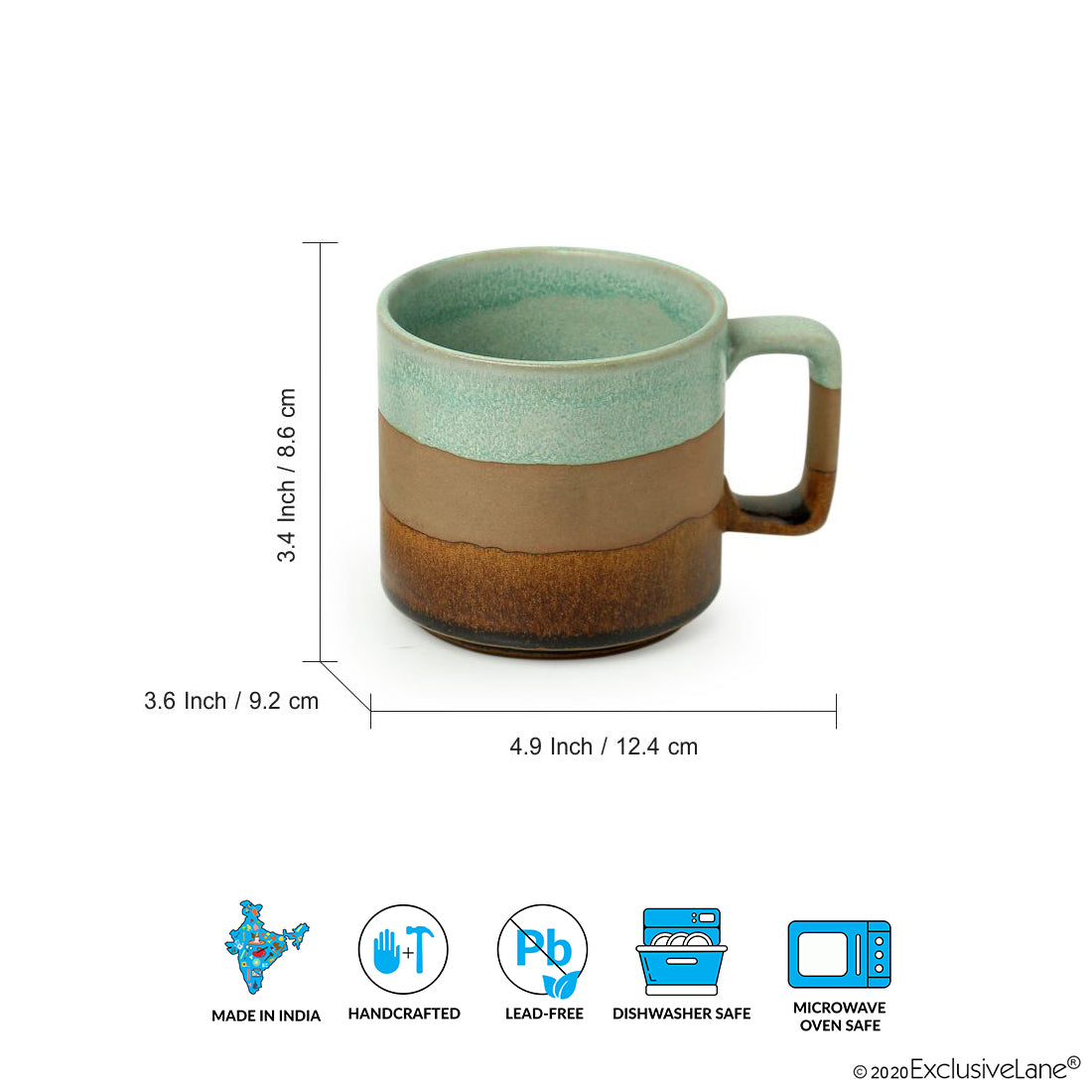 The 'Mint Chocolate' is a set of 2 studio pottery mugs each of 362 ML, handmade in Ceramic by skilled Indian artisans, ideal for having hot beverages like coffee, tea or milk with your loved ones. The set depicts triple hand glazing in 3 different colours with the middle layer displaying a terracotta-like finish. This set comes in semi-matte finish, is lead free as well as microwave and dishwasher safe.