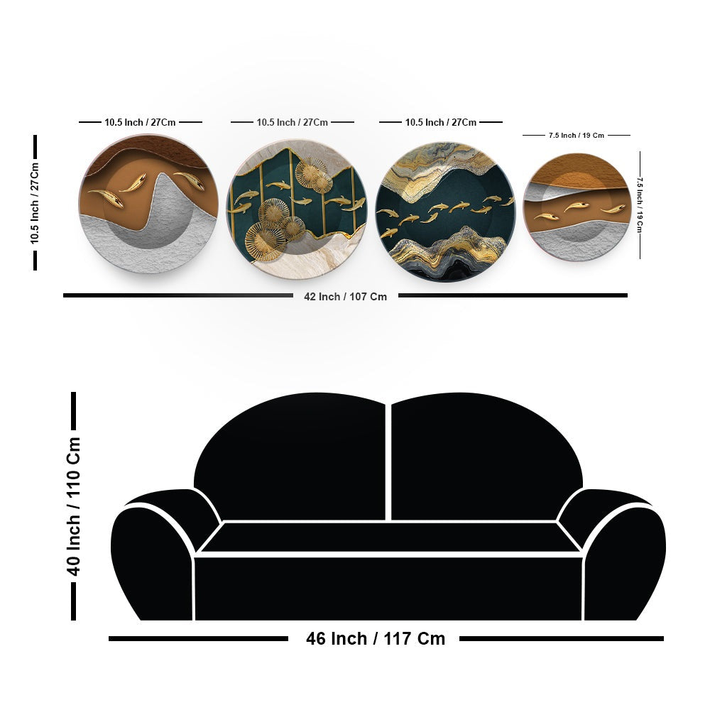 Modern Golden koi Fish Abstract Wall Plates Set of 4, This product is made with glossy finish and premium quality. If you're looking for a classy wall art for your home or office. Its classic design with a modern twist helps you keep an eye on the hour all the while adding panache to your decor. This designer Wall Plate will add charm to any room in your home. This wall plate can be a good gift for Living, Drawing & Dining Room, Outdoor, Gallery, Hotels, Bar, Lounge, Restaurants, Office, Reception, Kitchen Area, Balcony and Bathroom. Must be protected from sunlight, extreme temperature, dust and moisture to ensure long life. Final product colours may vary slightly from the display image due to the difference in printing resolution and digital resolution of various computer or mobile screen.
