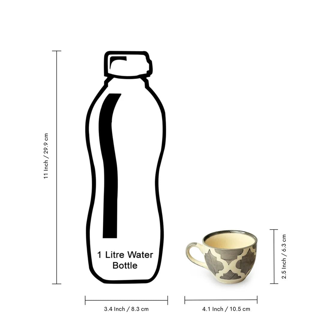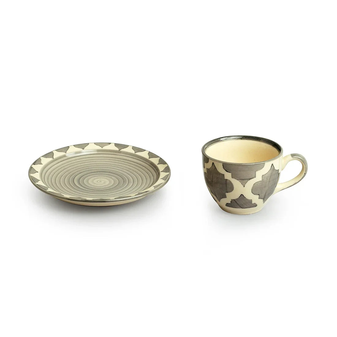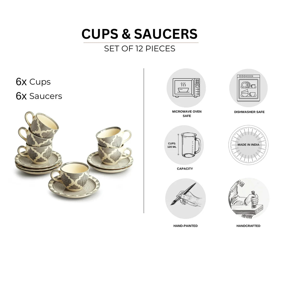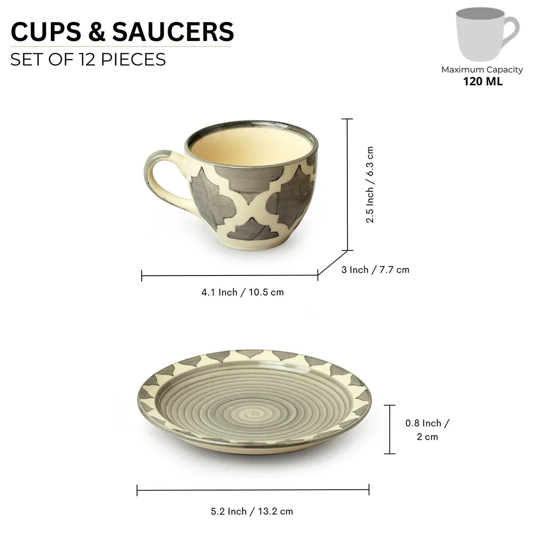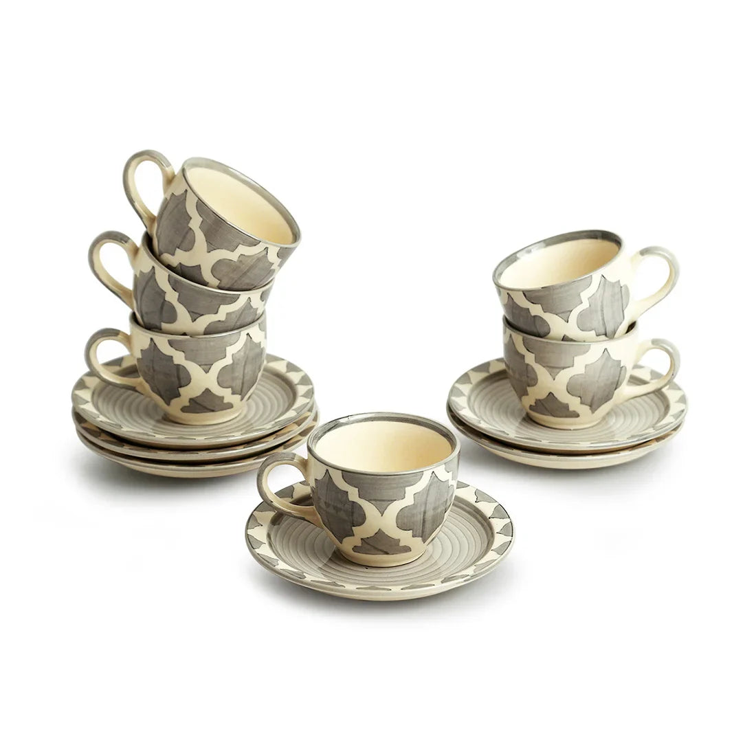 This 'Moroccan Essentials' is a set of 6 cups & saucers of 120 ml each that have been masterfully handcrafted & hand-painted in ceramic by skilled indian artisans. Hand-Painted in grey colored moroccan motifs; these cups & saucers come in glossy finish featuring an ergonomic & user friendly design approach. This set is perfect for sharing tea or coffee with your loved ones. These are also an ideal gift for housewarmings and the festive season. These are also microwave and dishwasher safe.