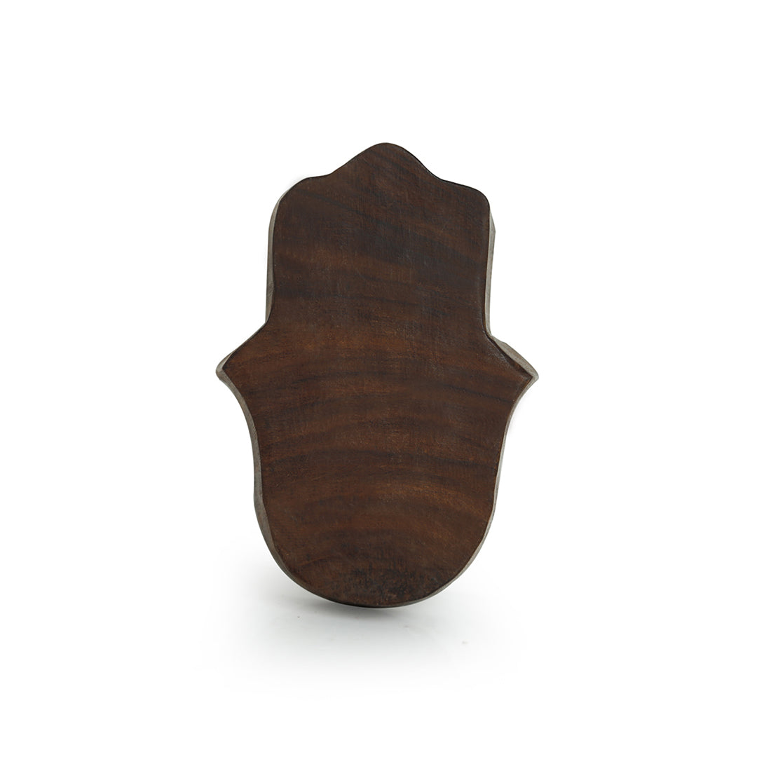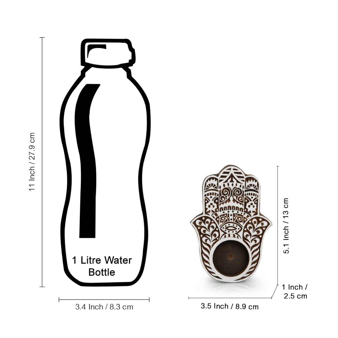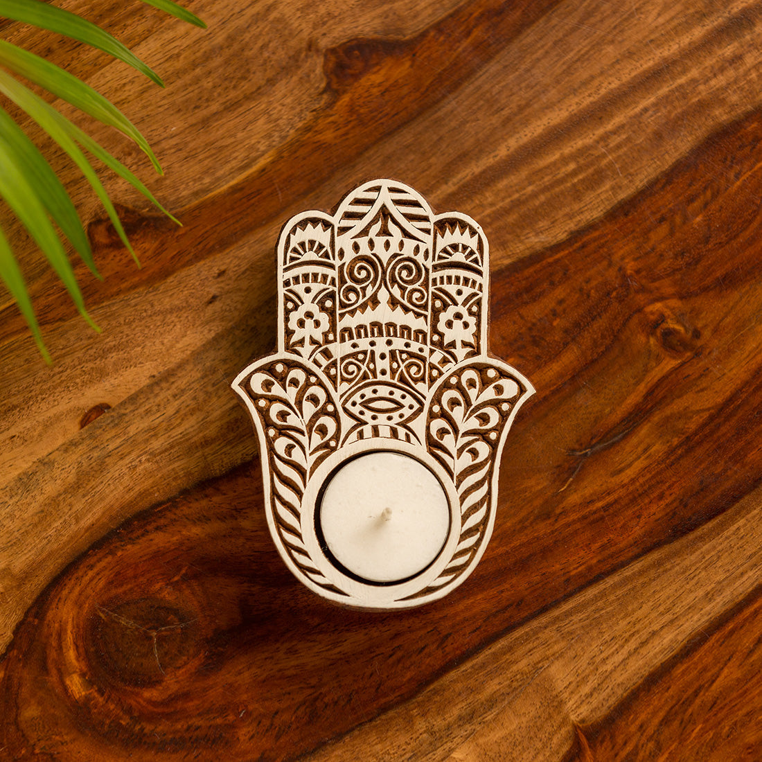 - This Sheesham Wooden Blocks Tea-Light Holder is Hand-Carved in the Shape of a Hand Depicting Bagh Pattern.