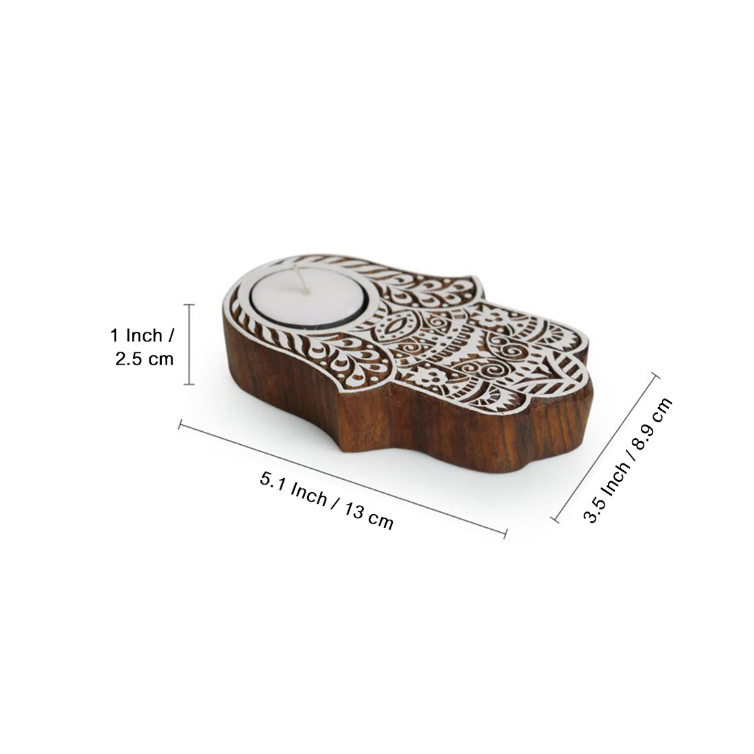 - These Sheesham Wooden Blocks Tea-Light Holders are Hand-Carved in the Shape of Hands Depicting Bagh Pattern.