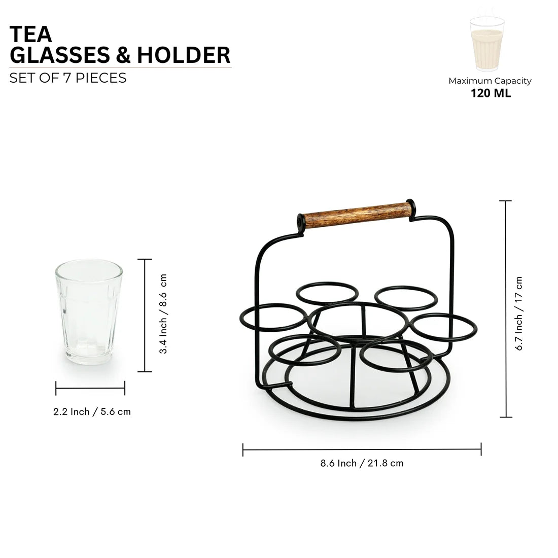 - Depicts an iron frame handcrafted as a holder with wooden handle. The tea chai glasses comes in a tapered shape.