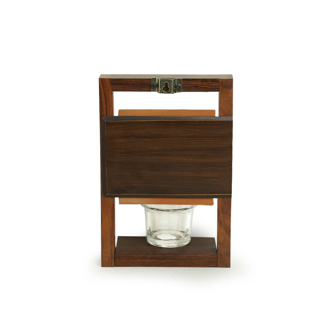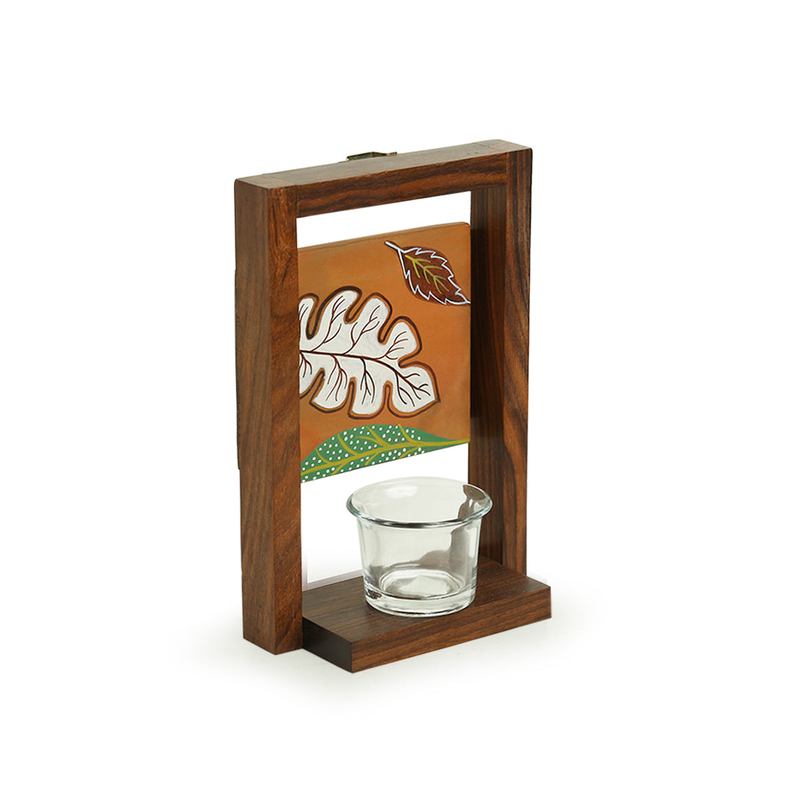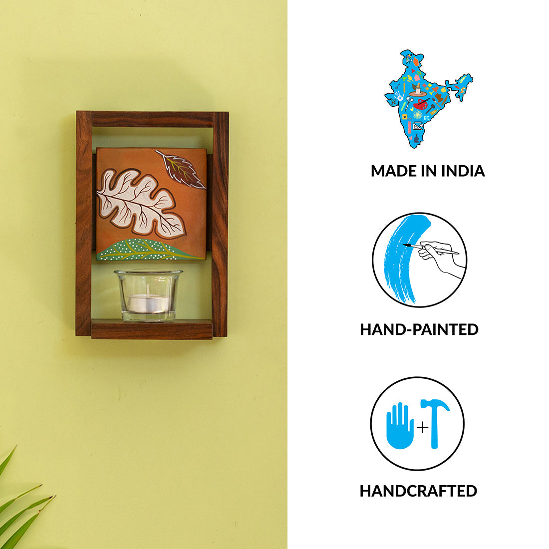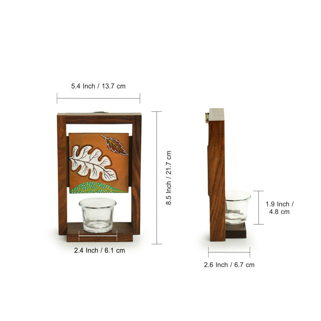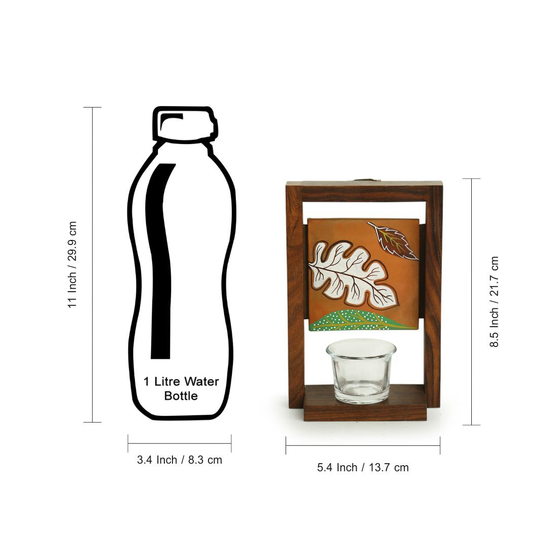 Inspired by the ‘Shades of a Leaf’ during the autumn season in the valleys of Kashmir, this wall hanging is Hand-painted comprising of a Glass pot along with a border made with the finest quality of Sheesham wood. The leaf pattern derives its influence from the deep forest areas of Kashmir. The golden-brown color represents the blanket created by the fallen leaves during the autumn season. This wall hanging is a marvelous combination of sophistication and aesthetics, assuring to please the eye of the viewer. This is ideal for placing a tea light candle and illuminating your wall to brighten up the space.