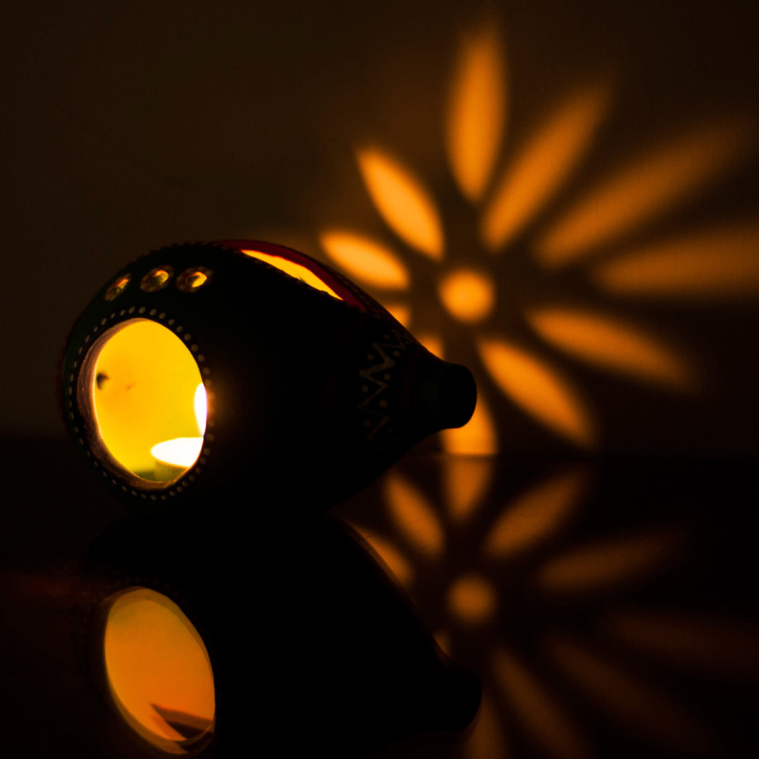 - A circular cutwork has been done at the centre to place the tealight adding in 3 small decorative cut outs crafted just above it.