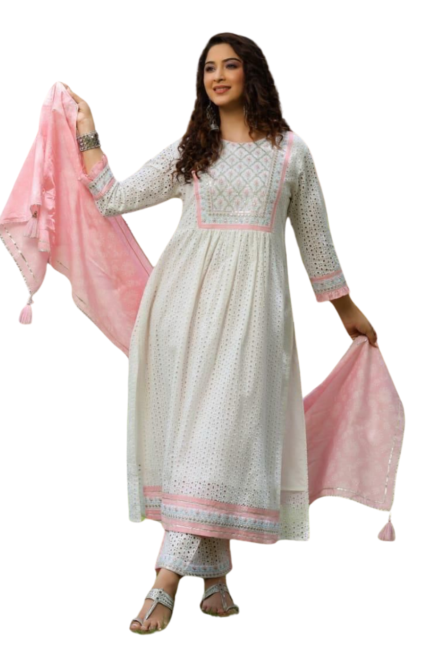 Women's Cotton Embroidered Nayra Cut Kurti With Pant and Dupatta Set
