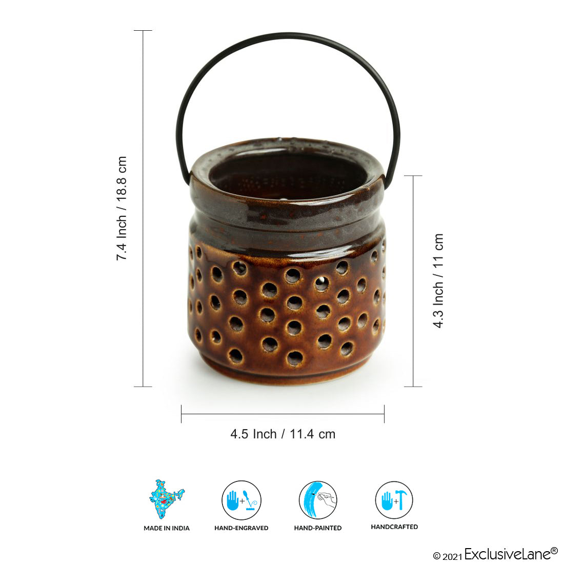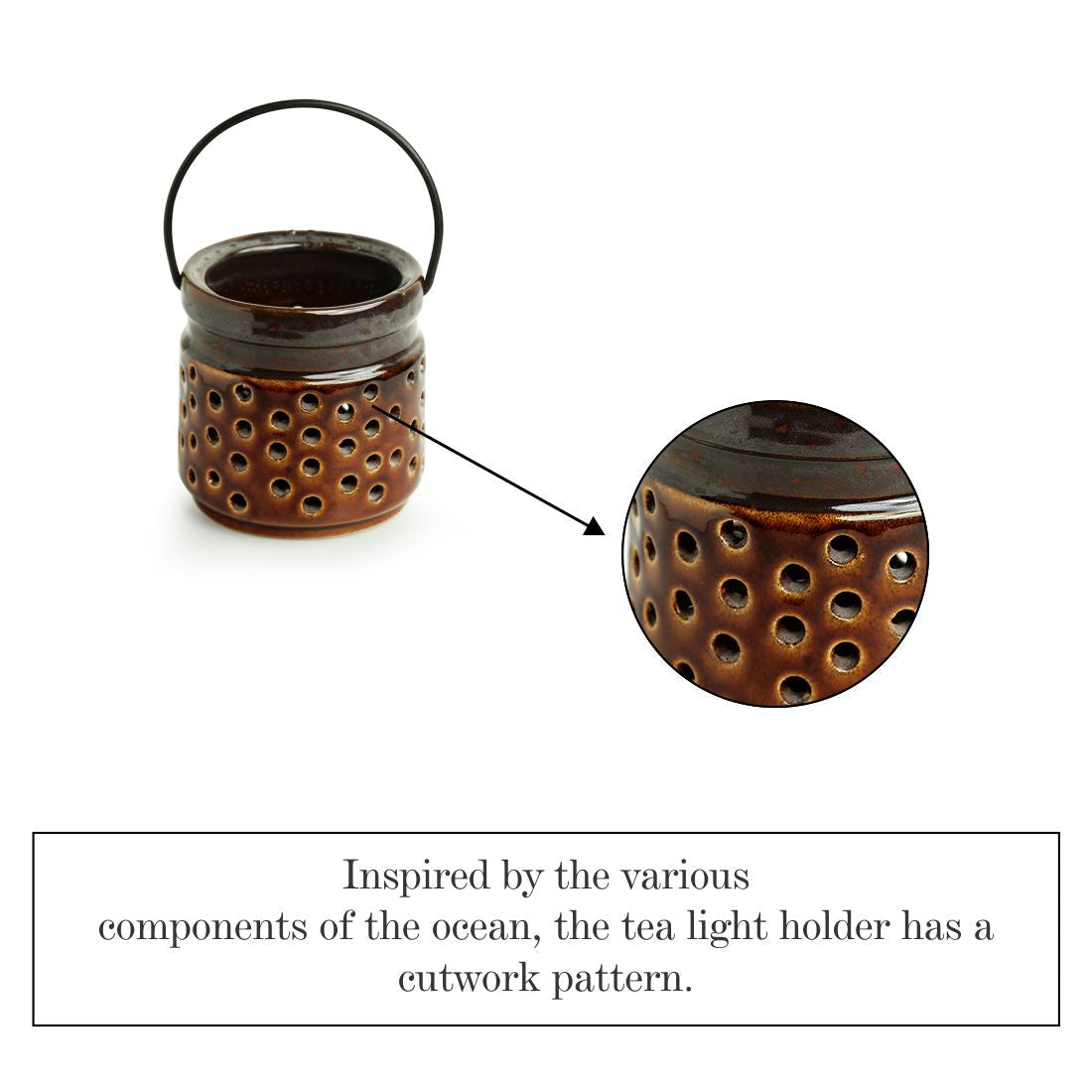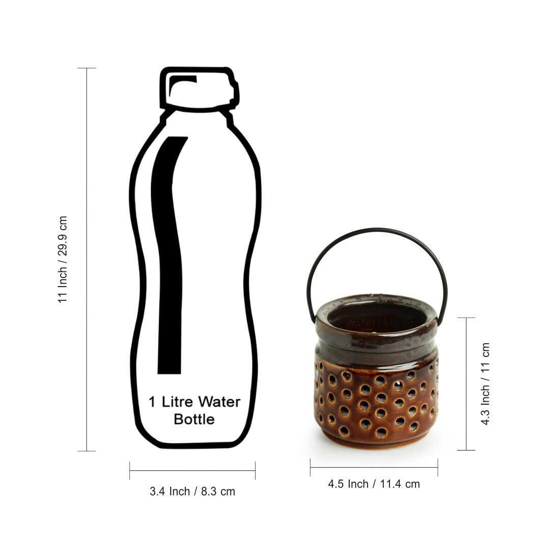 - The tea-light holder is handcrafted in creamic and the handle is made of iron.