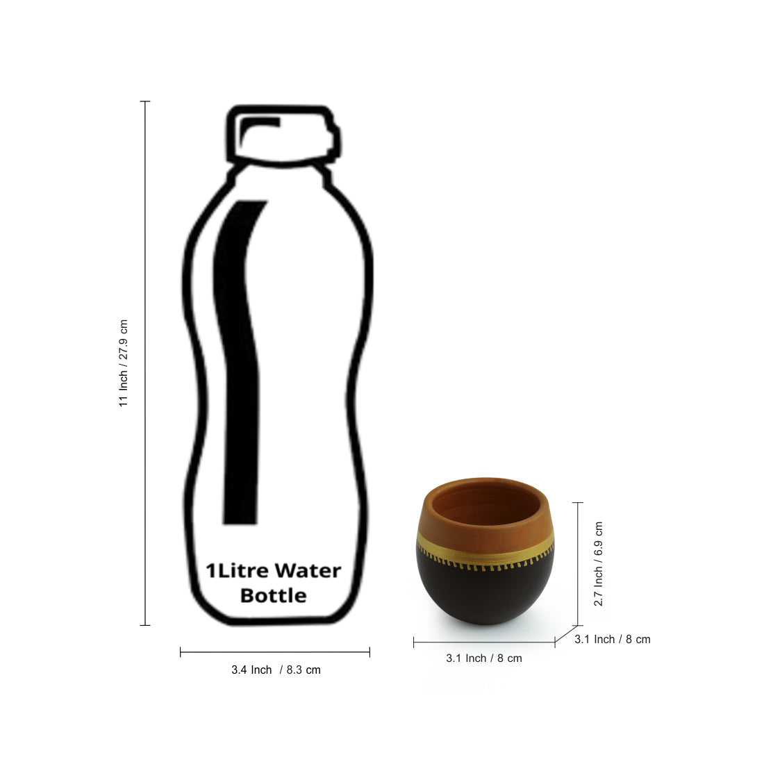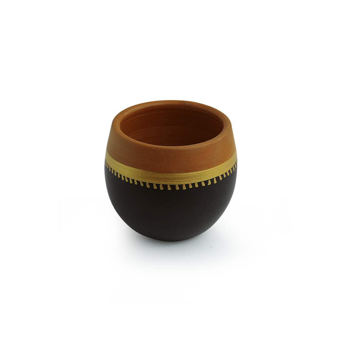 Skilfully handcrafted in terracotta and hand-painted with delicate details by artisans from the interiors of India, €˜Terra Sips€™ is a set of four quirky kullads, in black and raw earthen brown colour. The base of the kullads have been hand embellished in black with a golden lining in the centre. The rich jet black on the kullads base, it€™s artistic form of a body is complemented magically with golden lining. The compact design, simple utility, is perfect for your chai time of soltitude and togetherness with your loved ones.