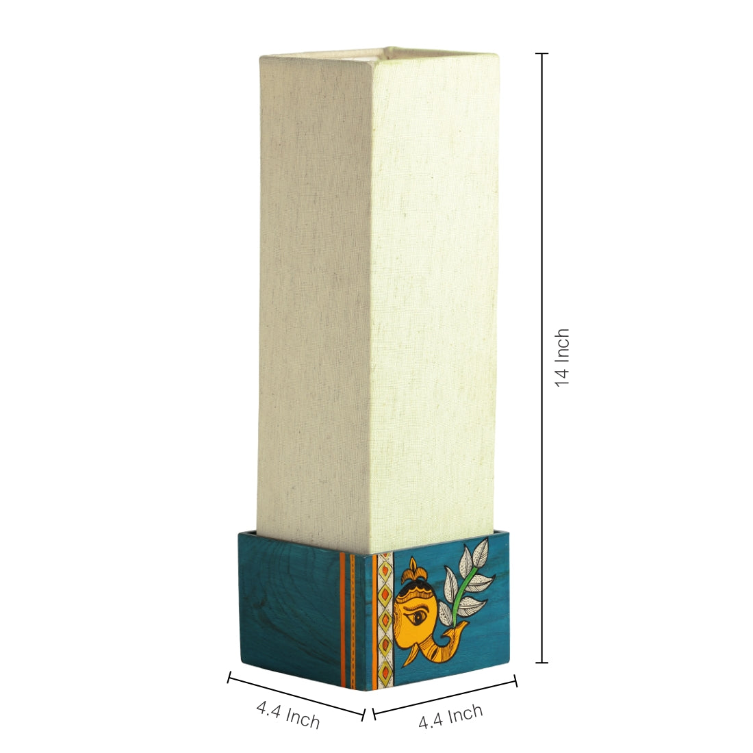 'Delicately handcrafted in mango wood and hand-painted with intricate folklore by craftspeople from the interiors of India, €˜The Blueberry Elephant€™ is a table lamp with an artistic square base holder, inspired from the historic art of Madhubani in Bihar. It has been hand-embellished with indigenous Madhubani art, depicting an elephant€™s face, holding a plant in it€™s trunk, in vibrant Indian colours on the berry-blue of the hand painted wooden base. In Madhubani painting traditions, the elephant is considered to be an auspicious aspect of nature and that it brings luck, power and tranquility. The compact design, simple utility, beautiful translucence of light through the shade, the use of the berry blue on the wood and the native folk tales handcrafted with love into this elegant table lamp, carry with itself a fragment of raw Indian serenity and coziness to your table tops and living spaces.