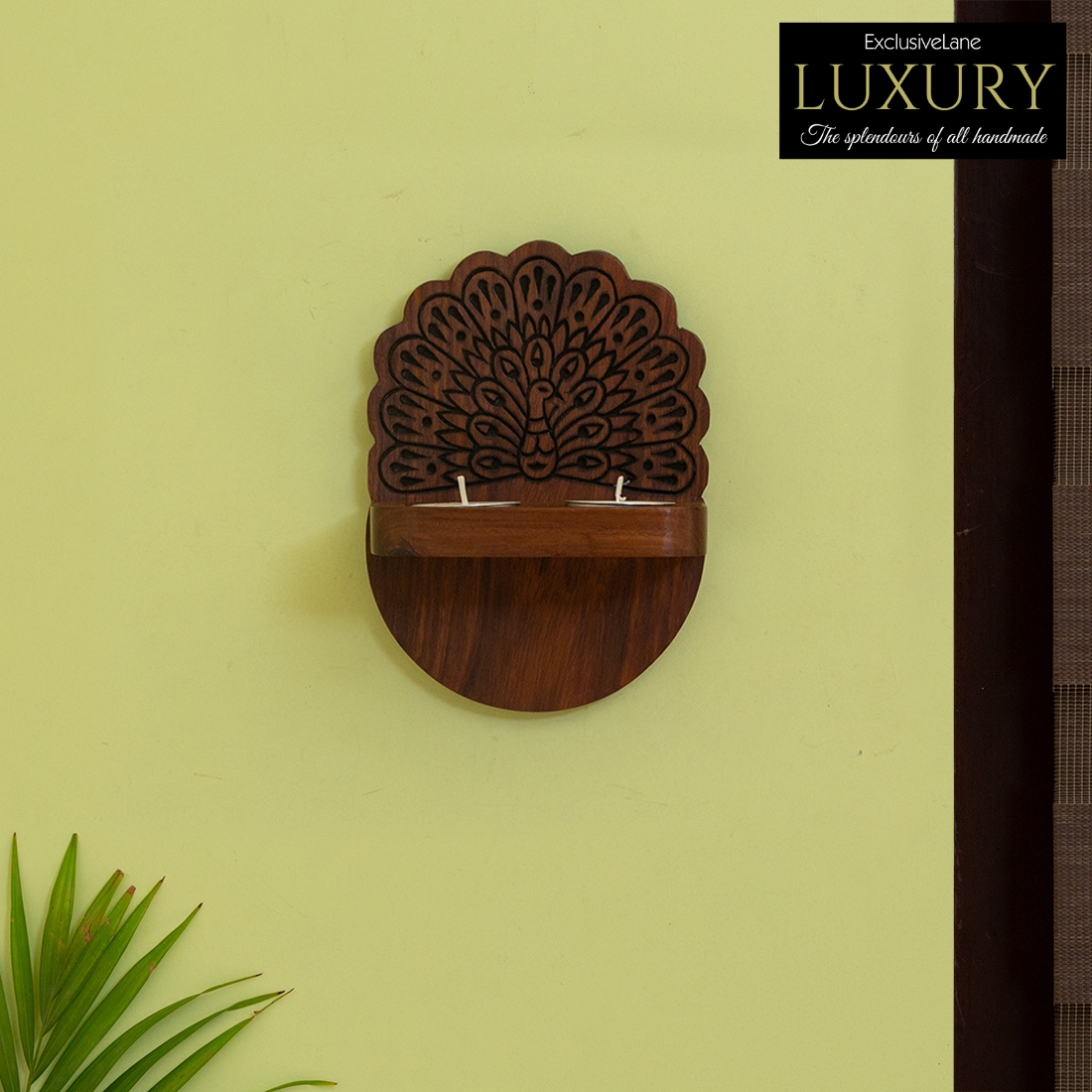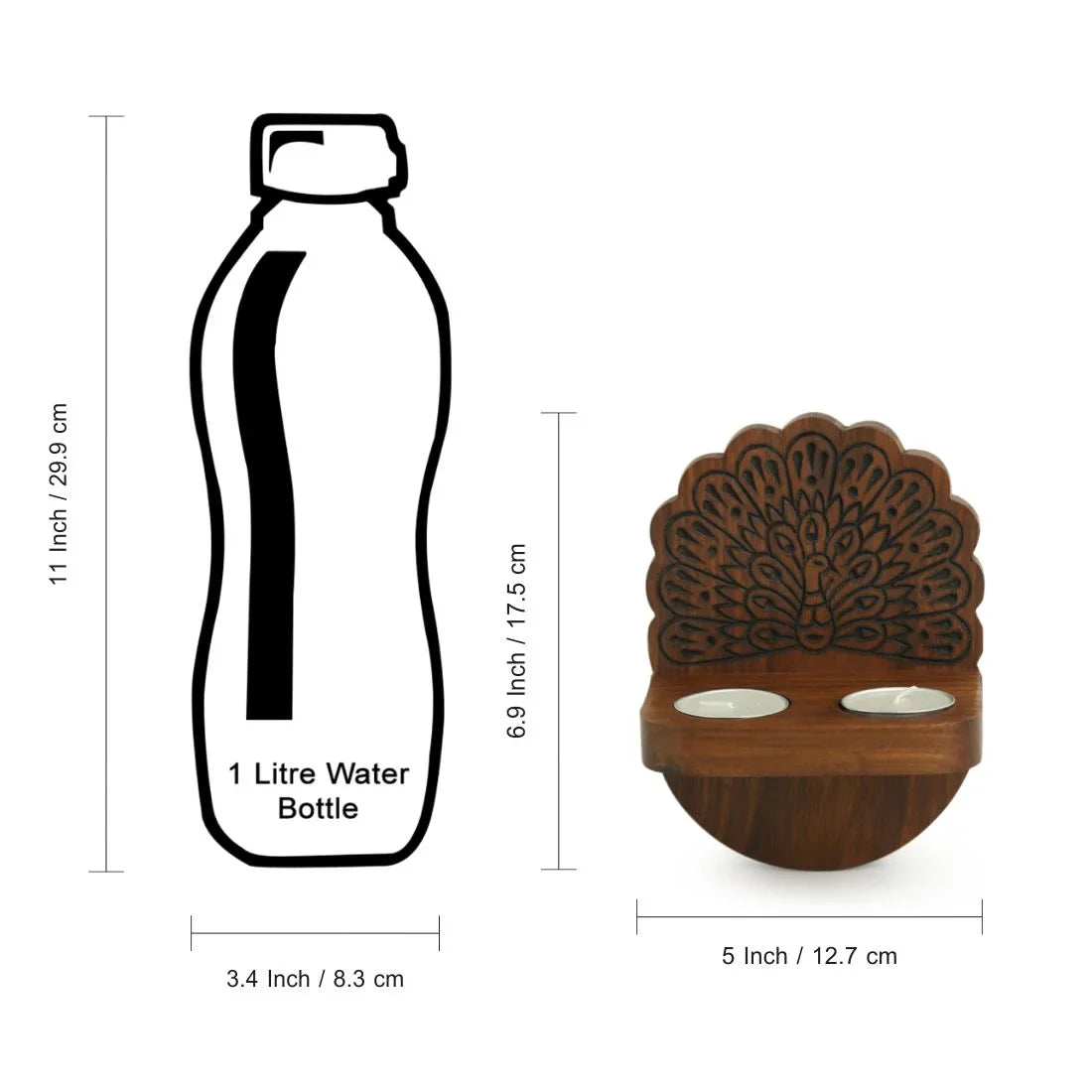 The Tea Light Holder from the collection 'The Dancing Peacock' is inspired by the majestic peacock and is handcrafted in Sheesham Wood. Intricate hand-carving has been done by skilled artisans of India and comes in an oil-based natural finish. This tea light holder comes with 2 slots for tea light chandles and has 2 holes in the back to hang it on the wall. It is ideal for lighting up your favourite spaces like living room, bedroom or office. It can also be used as a wall decor. FEATURES:- Handmade in India by artisans.- Inspired by the majestic feathers of a dancing peacock.- A dancing peacock has been hand-carved for a royal look.- Comes with 2 slots for tea light candles.- Ideal for lighting up your favourite spaces like living room, bedroom or office.- Also acts as wall décor.- Comes with 1 Tea Light Holder. - Comes with 2 holes at the back for hanging.- Ideal to be used as a gifting option for housewarming parties or festive seasons.- Handcrafted in Sheesham Wood.- Hand-carved depiciting a peacock dancing. - Comes in an oil-based natural finish.- Comes in 5.0' (L), 3.7' (W), 6.9' (H) Inch in size. - The tea light holder is a part the collection 'Peacock Woods'.- The weight of the tea light holder is 296 grams.