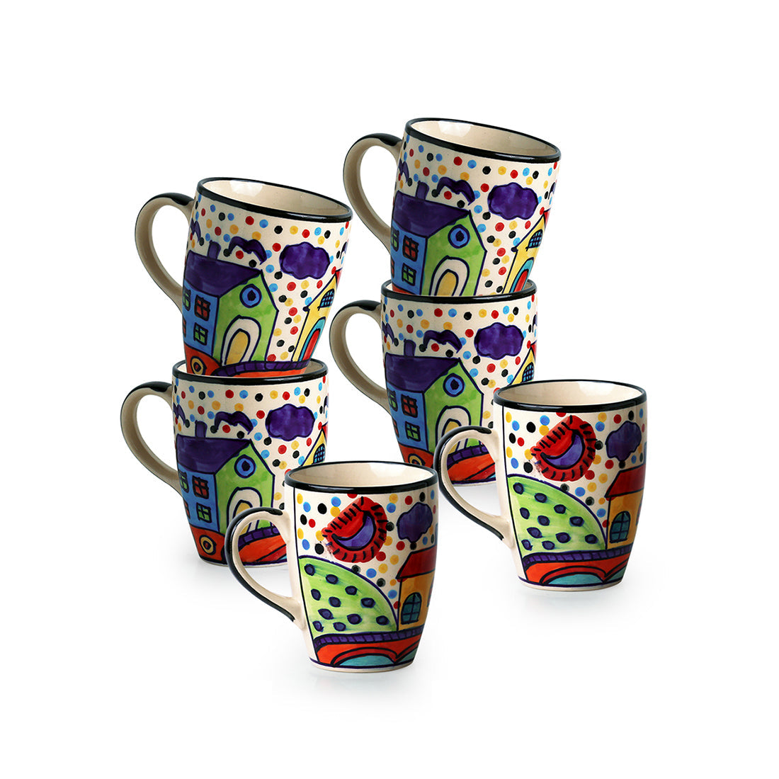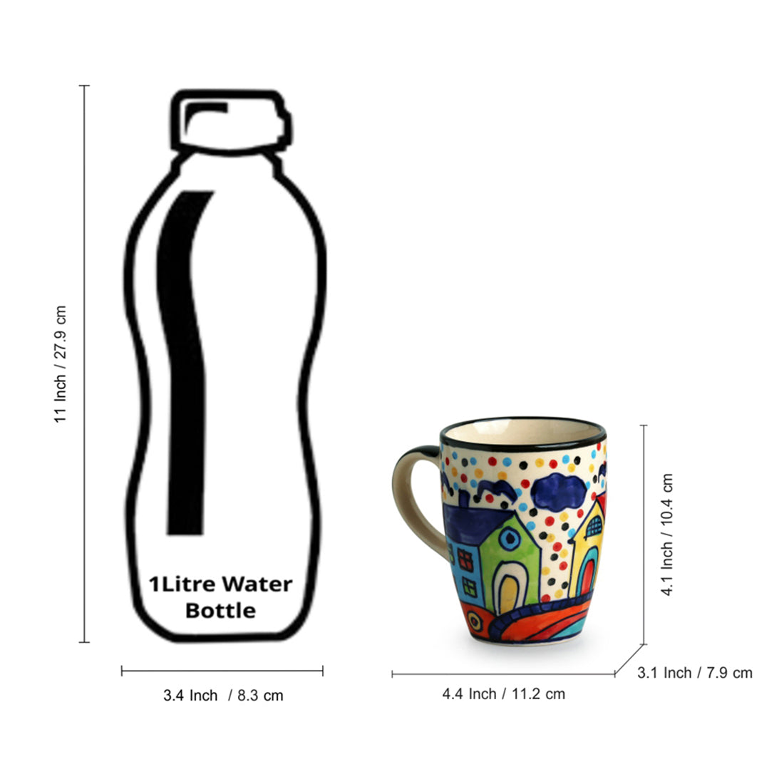 The spread of huts, with its picturesque triangular shapes and equally symmetrical windows, captures the many views of a serene Puducherry village. The constant chitter-chatter of the crowded market, with cacophonies of shouting vendors, and the primitive tree near the tranquil house are both embellished with birds in the sky and green fields on the land. The Bright red strokes of yellow and green sun drops and makes an abrasive patter on the surface of clay. The paintings on these designs remind us of the simplicity of village life and the placid vibes of the dreamy moon. The ' Hut Jumbo Cuppas' is a pair of two beautifully handcrafted coffee mugs, made with love by our team of artisans from Puducherry that will surely bring happy and colourful vibes to your kitchen spaces.