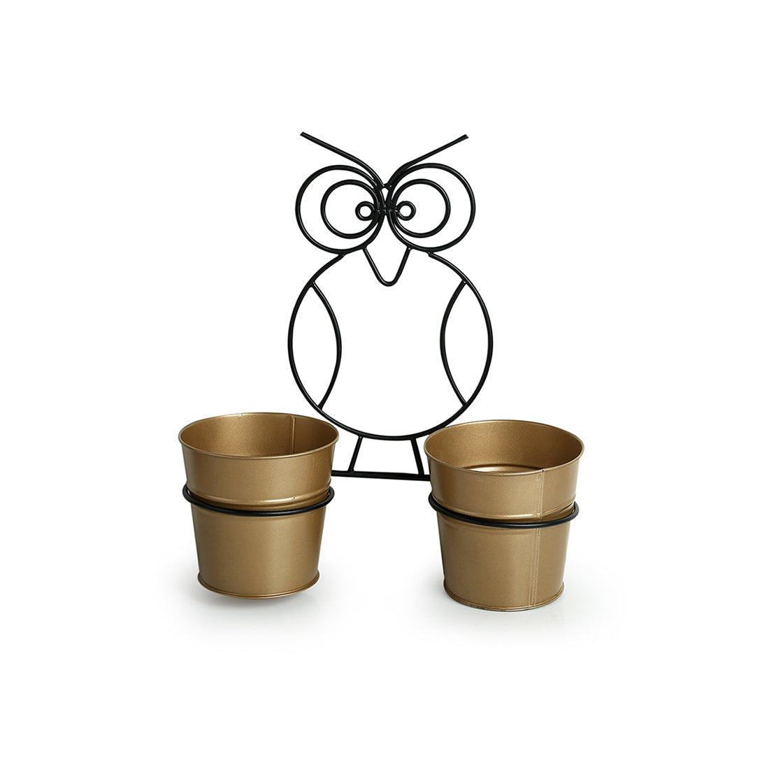 The Owl Buckets' from the collection 'The Ferric Wonders' is a set of garden décor comprising of 2 Classic Bucket-shaped detachable planter pots with a unique owl-shaped holder both made in galvanized iron to avoid rusting. Handcrafted with so much love and elegance by our artisans, this set of Light-Golden coloured planters and Black coloured holder come in glossy and matte finish respectively. 'The Owl Buckets' is an ideal set of décorative planter pots for planting your favourite plants on the wall and also in the tables or floors after removing from the holder and for enriching the atmosphere of your dining room, balcony or office with vibrations of refreshment and serene experience as a wall décor.