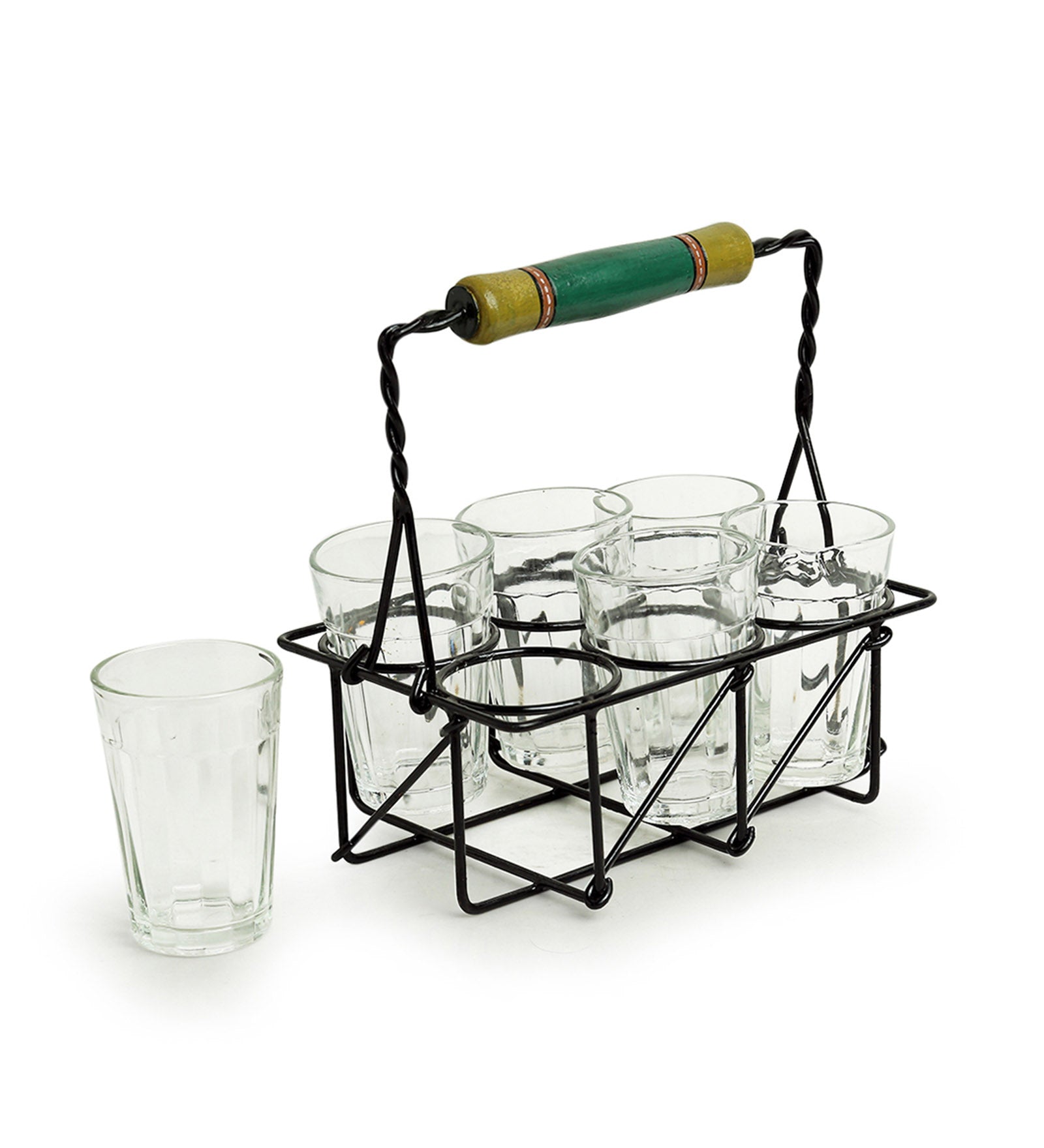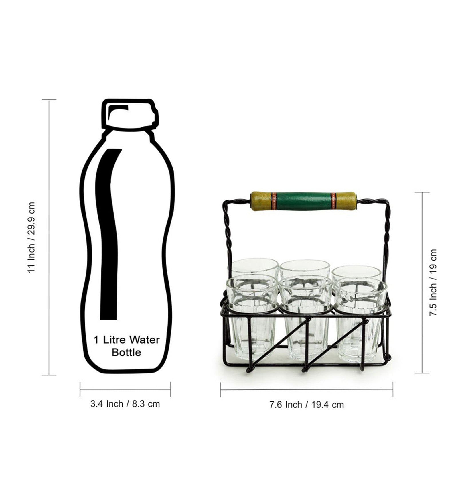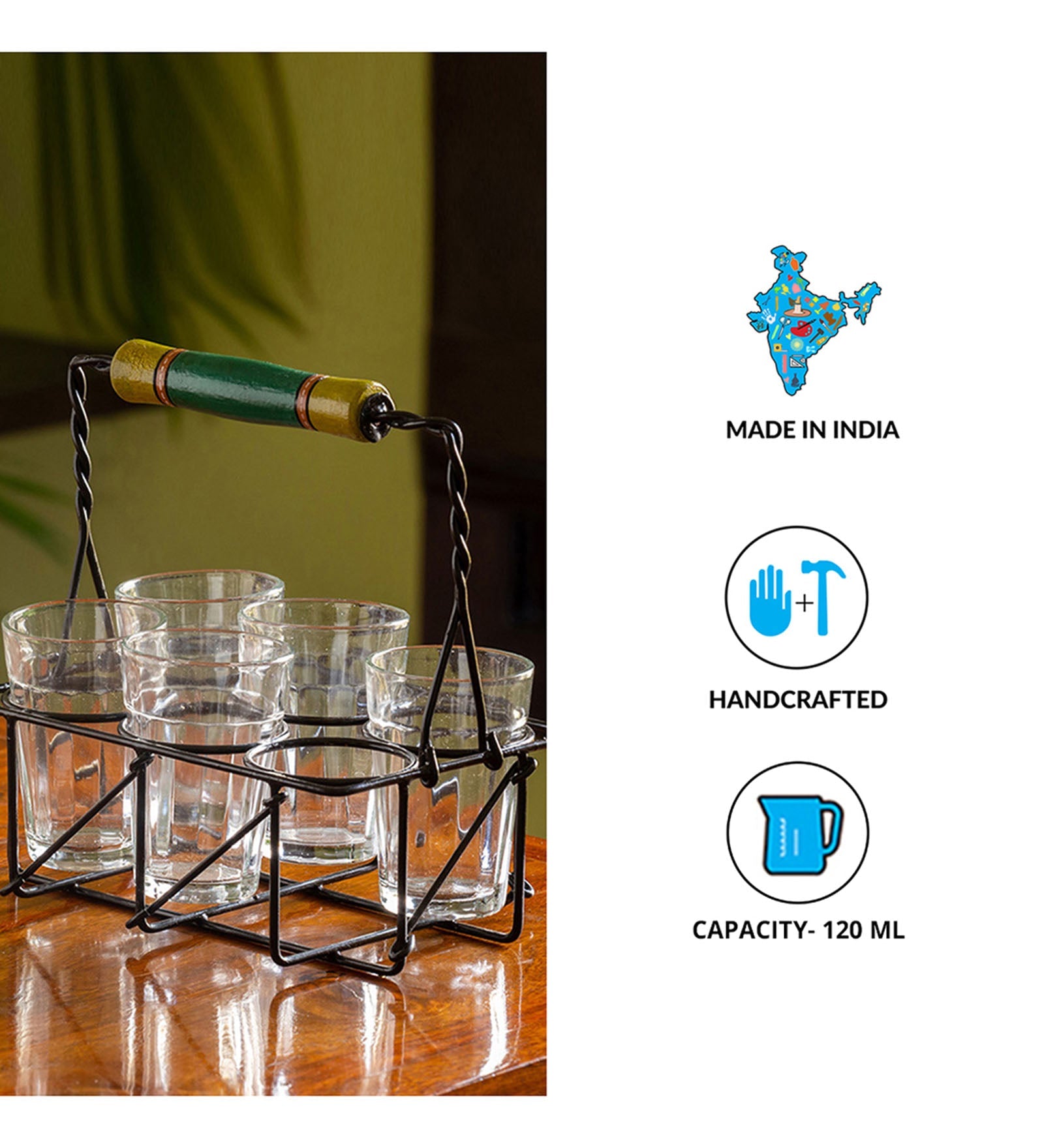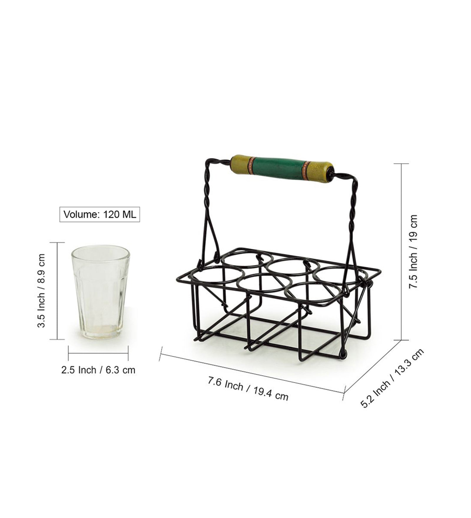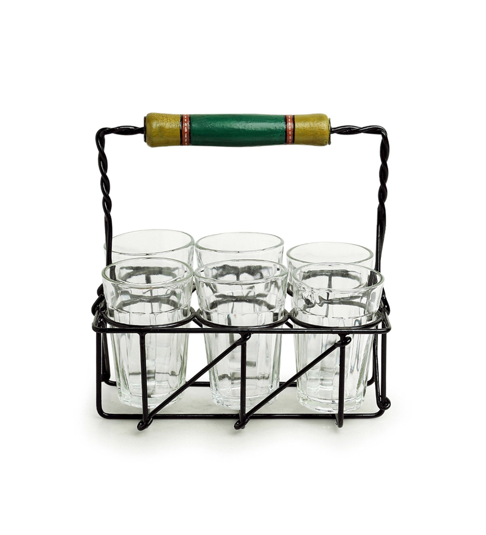 Inspired by the Chai Served at the Railway Station, this product jogs the memory of its users about their experiences in a train. Be it The Glass Cups in the Shape of Cutting Chai Cups served on the train or the Holder Shaped like the one carried by the tea vendors, this product ensures nostalgia. These are ideal for serving tea to your guests. Can also be used to serve beverages of your choice.