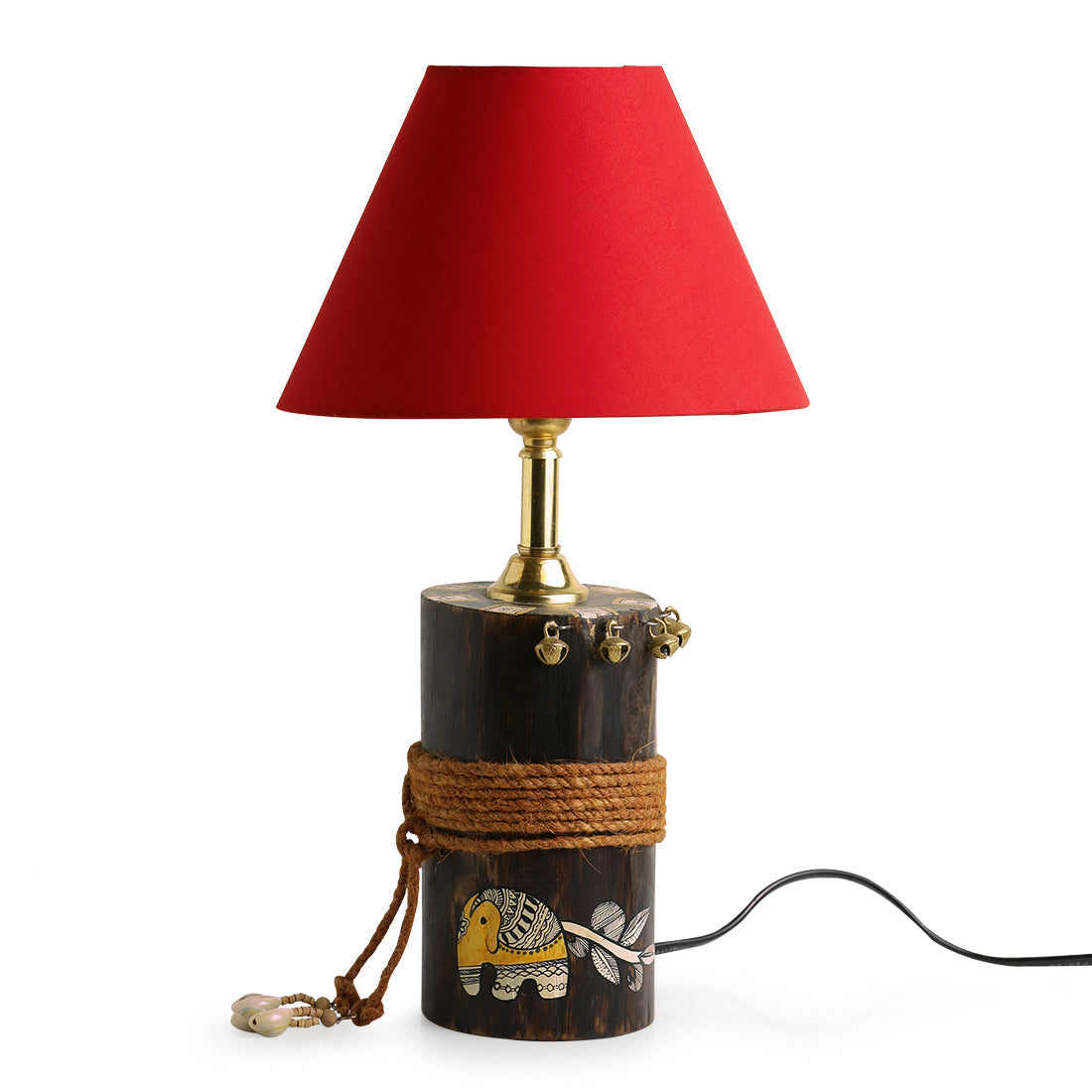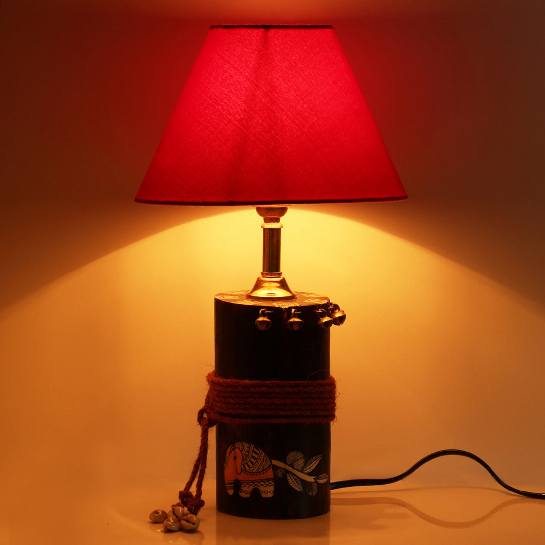 Delicately handcrafted in liptis wood and hand-painted with intricate folklore by craftspeople from the interiors of India, €˜The Red-Shade Log€™ is a beautifully artistic table lampshade with a wooden log for the base holder. Inspired from the historic art of Madhubani in Bihar, the natural brown of the wooden log base has been hand-embellished with indigenous Madhubani art, depicting an elephant with a plant motif, in earthy Indian colours. In Madhubani painting traditions, the elephant is considered to be an auspicious aspect of nature and that it brings luck, power and tranquility. The compact design and the addition of simple embellishments of raw dori and traditional Indian metal ghunghrus are magically complimented with the beautiful red shade. The falling of soft light diffusing through the shade and the native folk tales handcrafted with love into this elegant table lampshade, carry with itself a fragment of raw Indian serenity and coziness to your table tops and living spaces.
