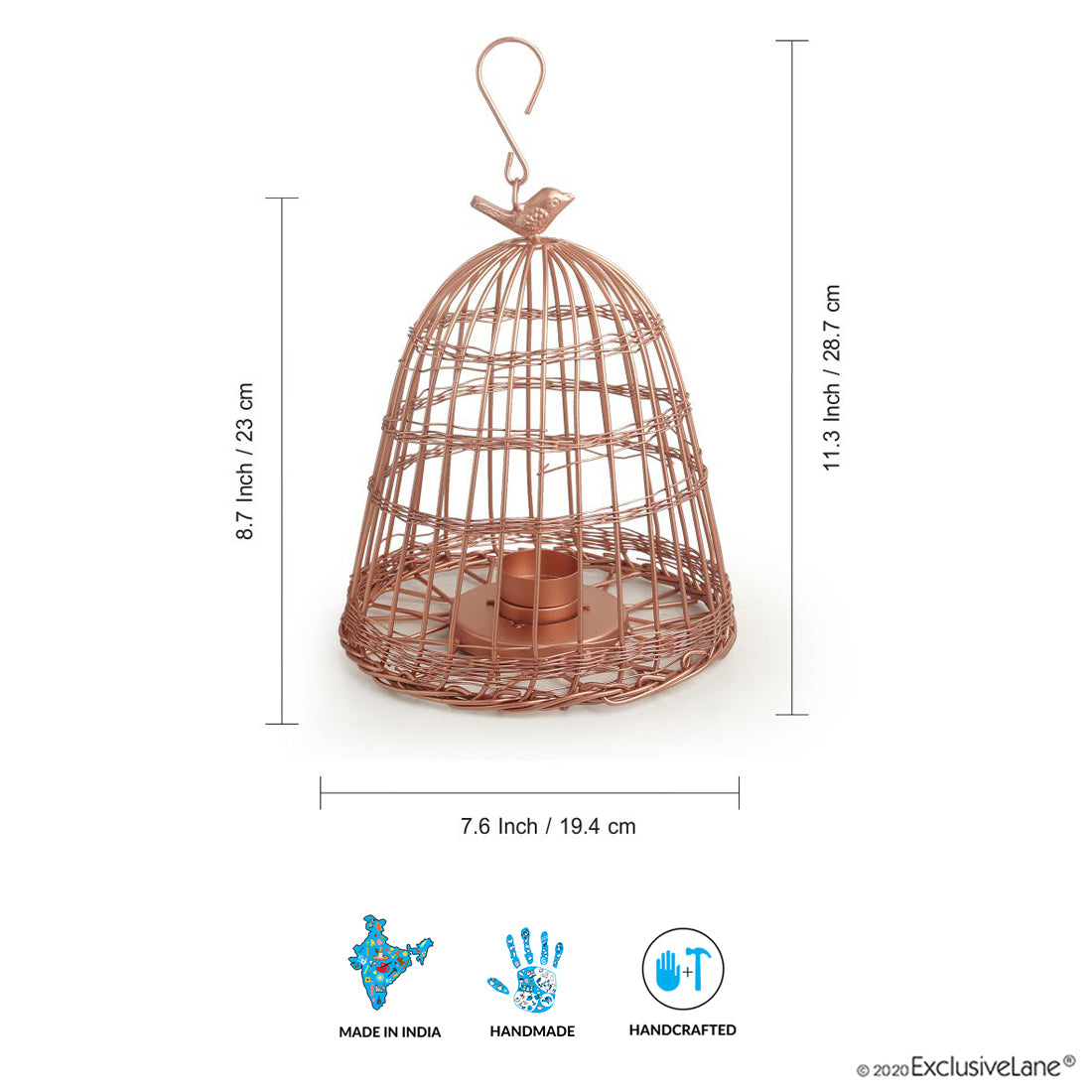 The Wired Conicals' from collection 'Art Gone Haywire: A Tale from a Sanctuary' is a table & hanging tea light holder in a conical shape rounded from top and handcrafted in iron by skilled artisans of India. It comes in copper powder coated semi-glossy finish depicting a beautiful forged and barred pattern formed with wire along with a bird on top. It is ideal for lighting up your favourite spaces like living room, bedroom or office to create a warm ambience. 'The Wired Conicals' is also a very modish table decorative showpiece and a beautiful gift option for your loved ones for special occasions such as anniversaries, house warming and festivals.