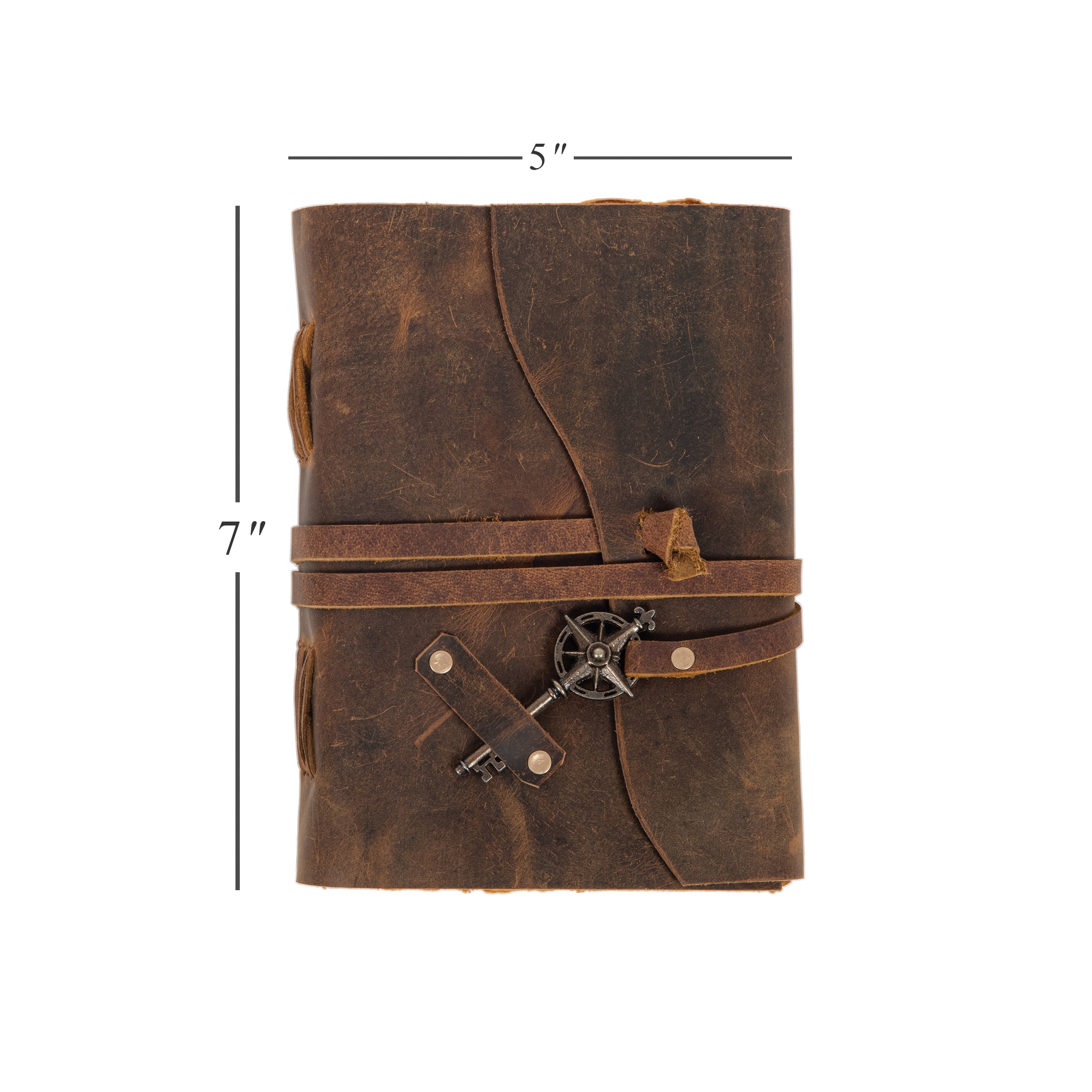 A vintage leather-bound journal with an attached antique key is like stepping into a treasure trove of secrets from the past. Imagine a book with a cover made of old, soft leather, like a well-worn jacket that tells stories of its own. Inside, the pages are yellowed with age, inviting you to fill them with your own adventures and thoughts. But what makes this journal truly special is the antique key dangling from its spine, like a silent guardian. This key might unlock a hidden compartment within the journal or perhaps it's a symbol of the mysteries waiting to be unlocked within its pages. This journal is a timeless treasure, bridging the gap between past and present.