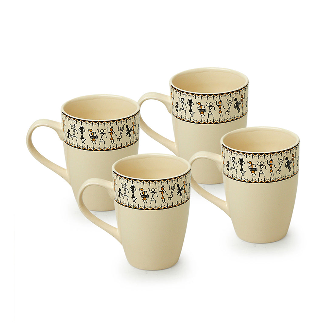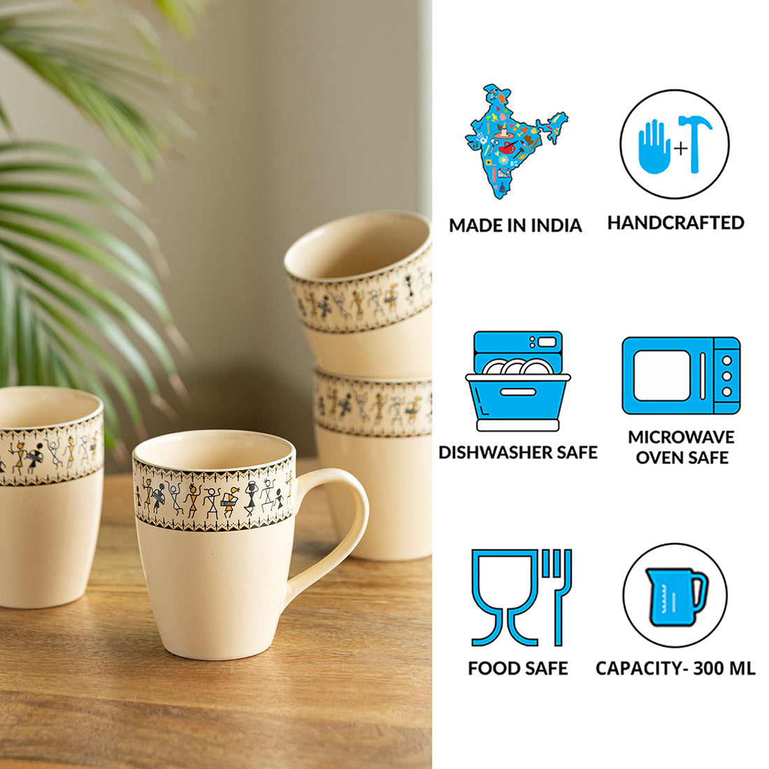 The ‘Whispers of Warli’ set of 2 of mugs of 300 ml each from the ‘Whispers of Warli’ collection has been masterfully handcrafted in Ceramic by Indian artisans. Depicting the glorious, ancient Warli folk-art style, each mug has been perfectly printed with black decals of exquisite Warli motifs on an ivory white base. The elegant glaze adds a stunning glossy finish. They are excellent for sharing hot beverages like tea and coffee with your loved ones. The mugs are microwave and dishwasher safe.