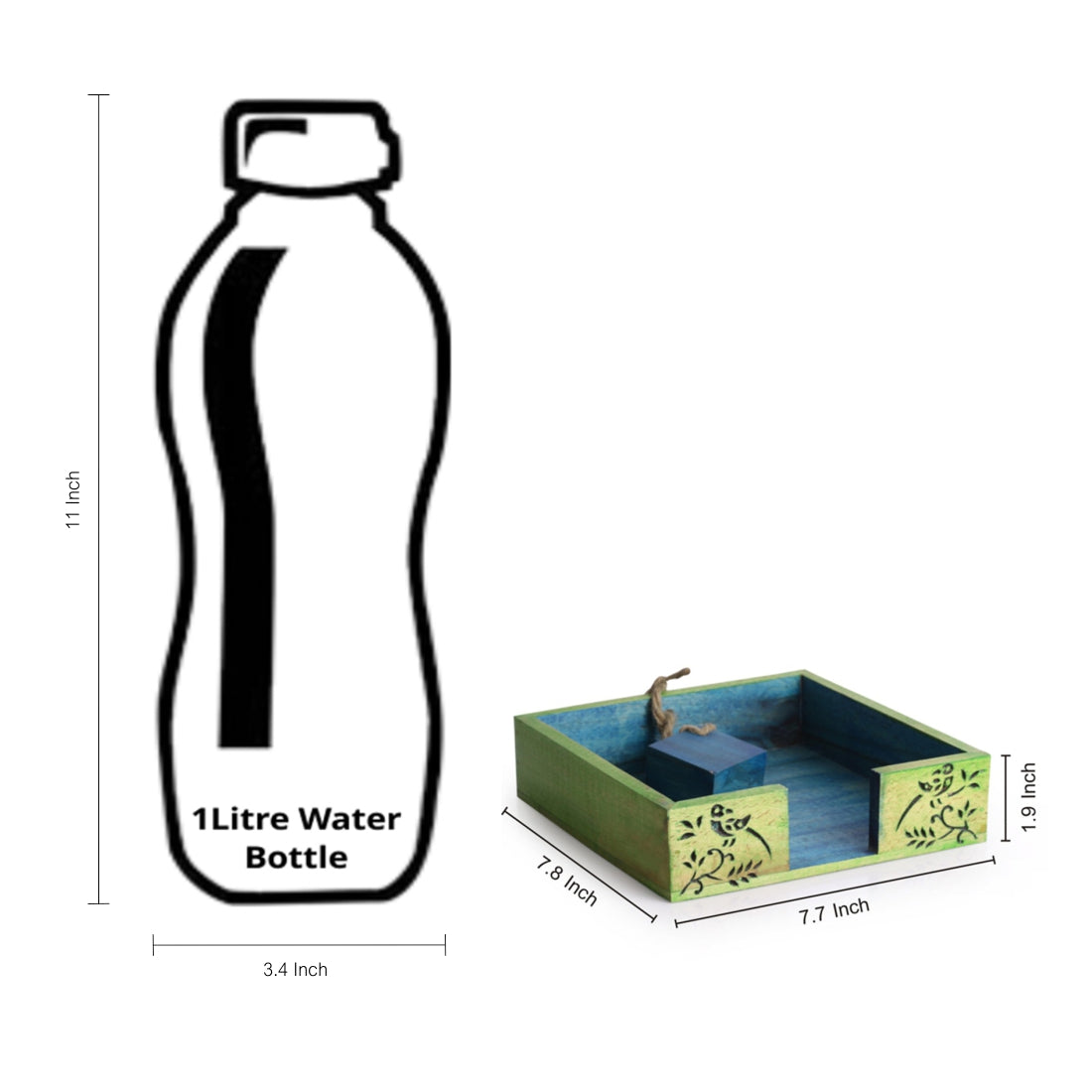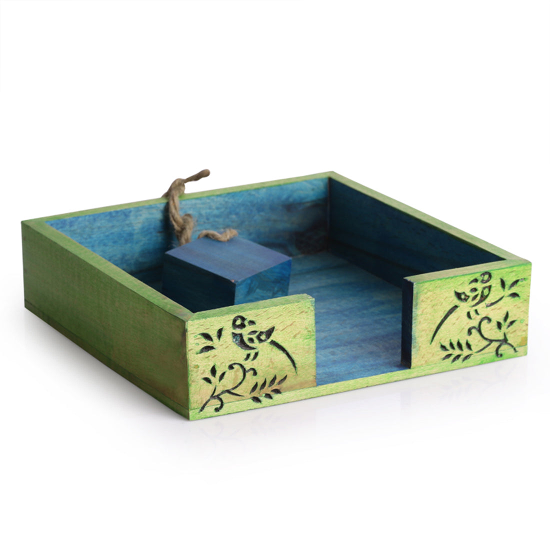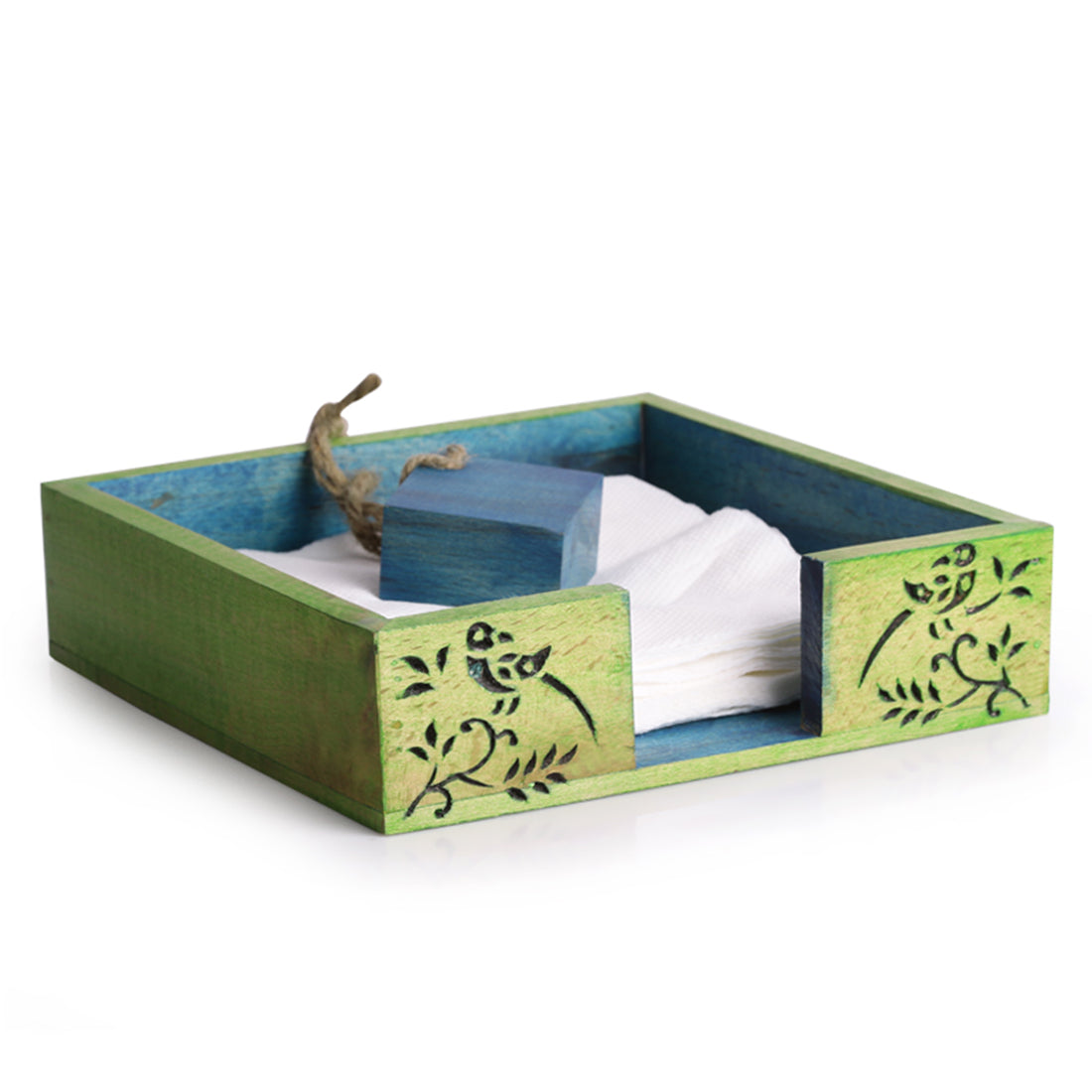 This floral leaf designed wooden napkin holder is a perfect addition in your kitchen, living or study room. Handcrafted from Steam Beech Wood, this napkin box comes in an appealing dual tone of green and light blue color. The holder features a unique wooden cube tied with jute to hold the napkins. The leaves &bird perched on stem design, carefully burnt on wood making it an unique addition to your kitchen, living or study room. Let your home be an embodiment of unusual look as you get this little charm for your abode right away.