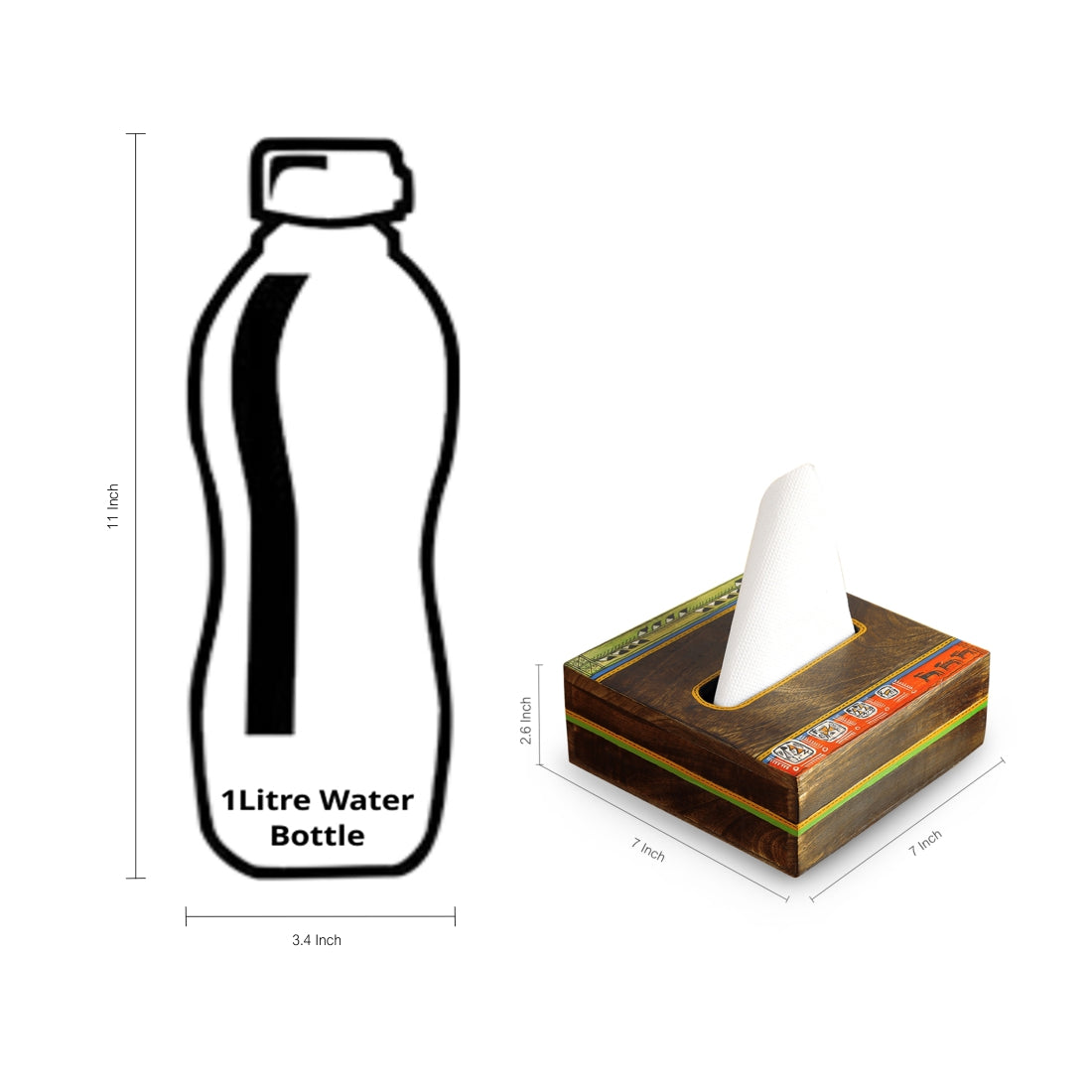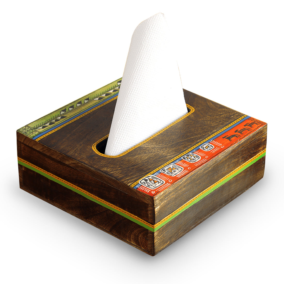 Beautifully handcrafted in Mango wood by craftspeople from the interiors of India, €˜Woody Hues€™ is an easy access rectangular paper napkin holder, inspired from the simple life of Indian tribes and hand-embellished with minimal detailed Warli art. The rich natural colour of the wood is complemented with hand-embellished rustic paintings in miniature Warli tribal scenes and minimal patters around the borders and edges. The compact design, fine finishing of wood nooks and simple utility of easy paper napkin filling and usage complemented magically with earthy pastel Warli art, carries with itself a fragment of raw Indian tribal culture to your table and living spaces. The tribal tales handcrafted with love into this elegant paper napkin holder are perfect for all occasions, for you and your loved ones.